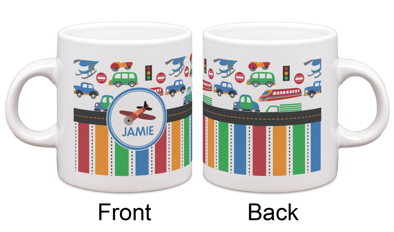 A gray with yellow "road" band ties the two patterns together. A blue and white circle label showcases the airplane and allows for personalization of your choice underneath. You can customize further by picking any of the transportation pictures in the pattern to place in the label. Just let us know what you want.