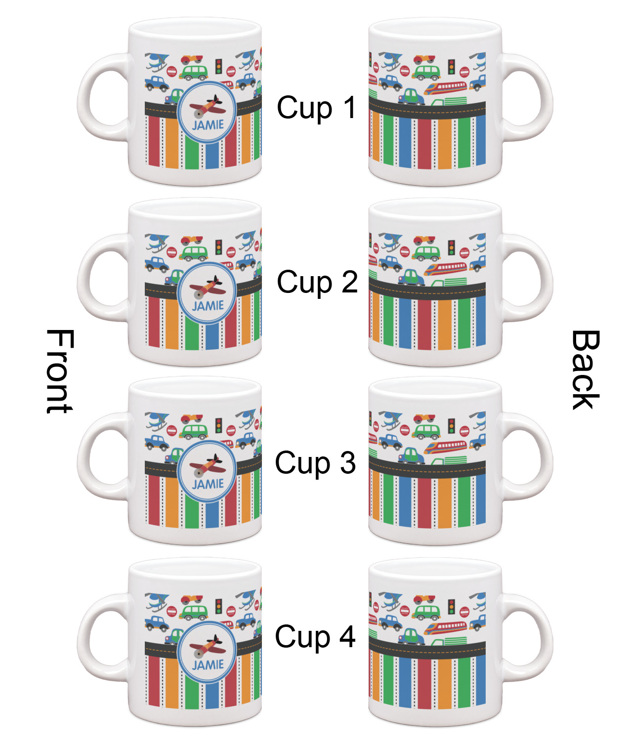 A gray with yellow "road" band ties the two patterns together. A blue and white circle label showcases the airplane and allows for personalization of your choice underneath. You can customize further by picking any of the transportation pictures in the pattern to place in the label. Just let us know what you want.