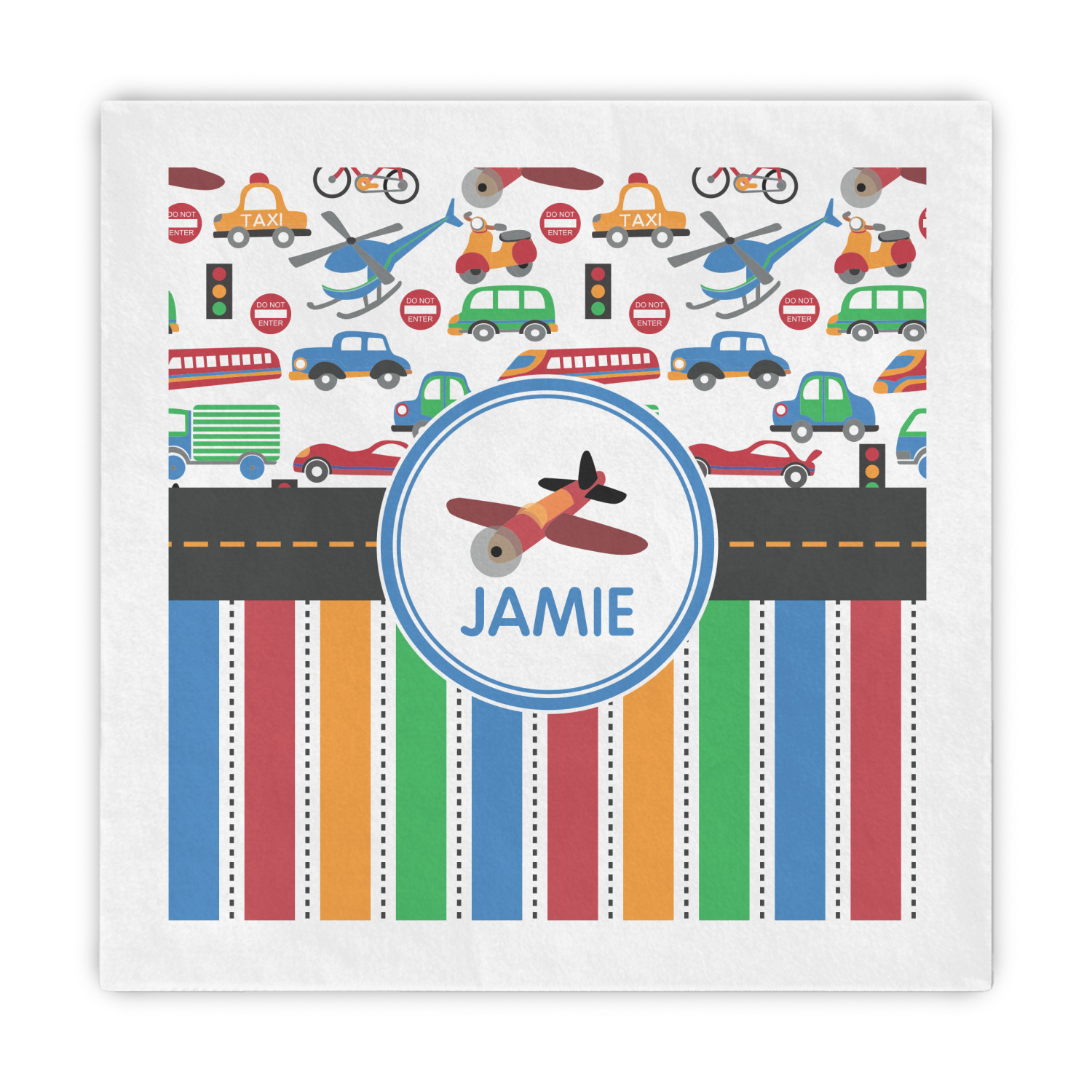 A gray with yellow "road" band ties the two patterns together. A blue and white circle label showcases the airplane and allows for personalization of your choice underneath. You can customize further by picking any of the transportation pictures in the pattern to place in the label. Just let us know what you want.