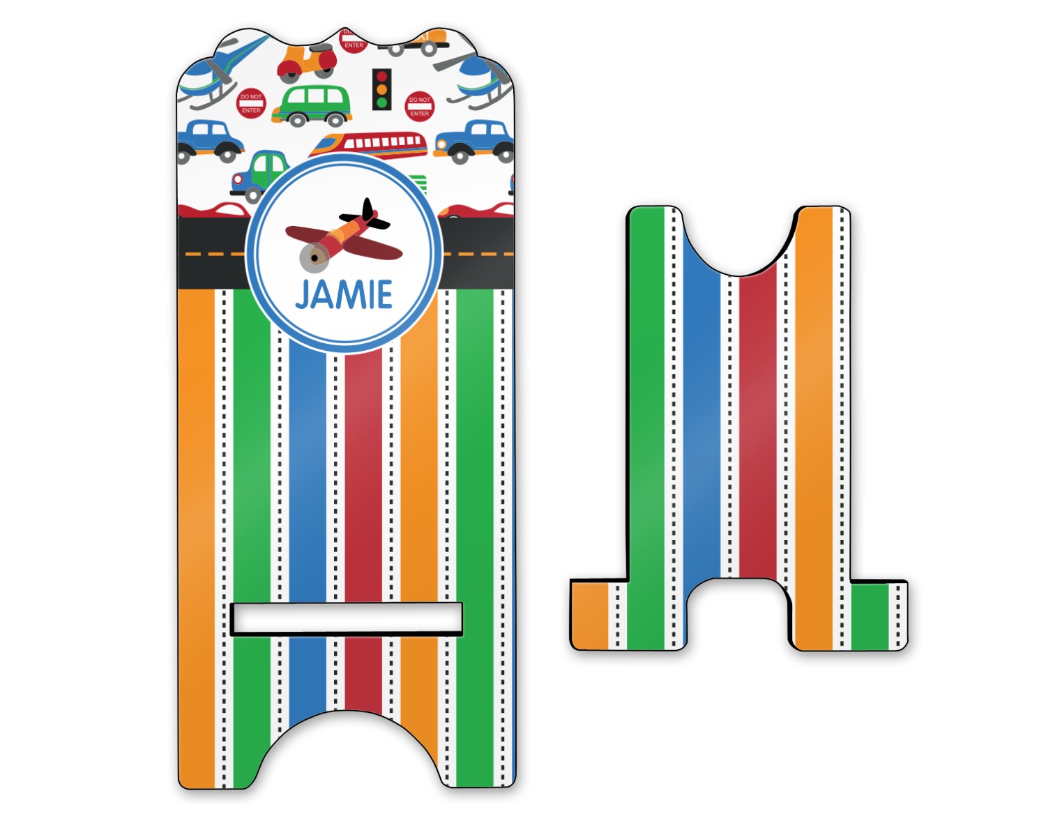 A gray with yellow "road" band ties the two patterns together. A blue and white circle label showcases the airplane and allows for personalization of your choice underneath. You can customize further by picking any of the transportation pictures in the pattern to place in the label. Just let us know what you want.