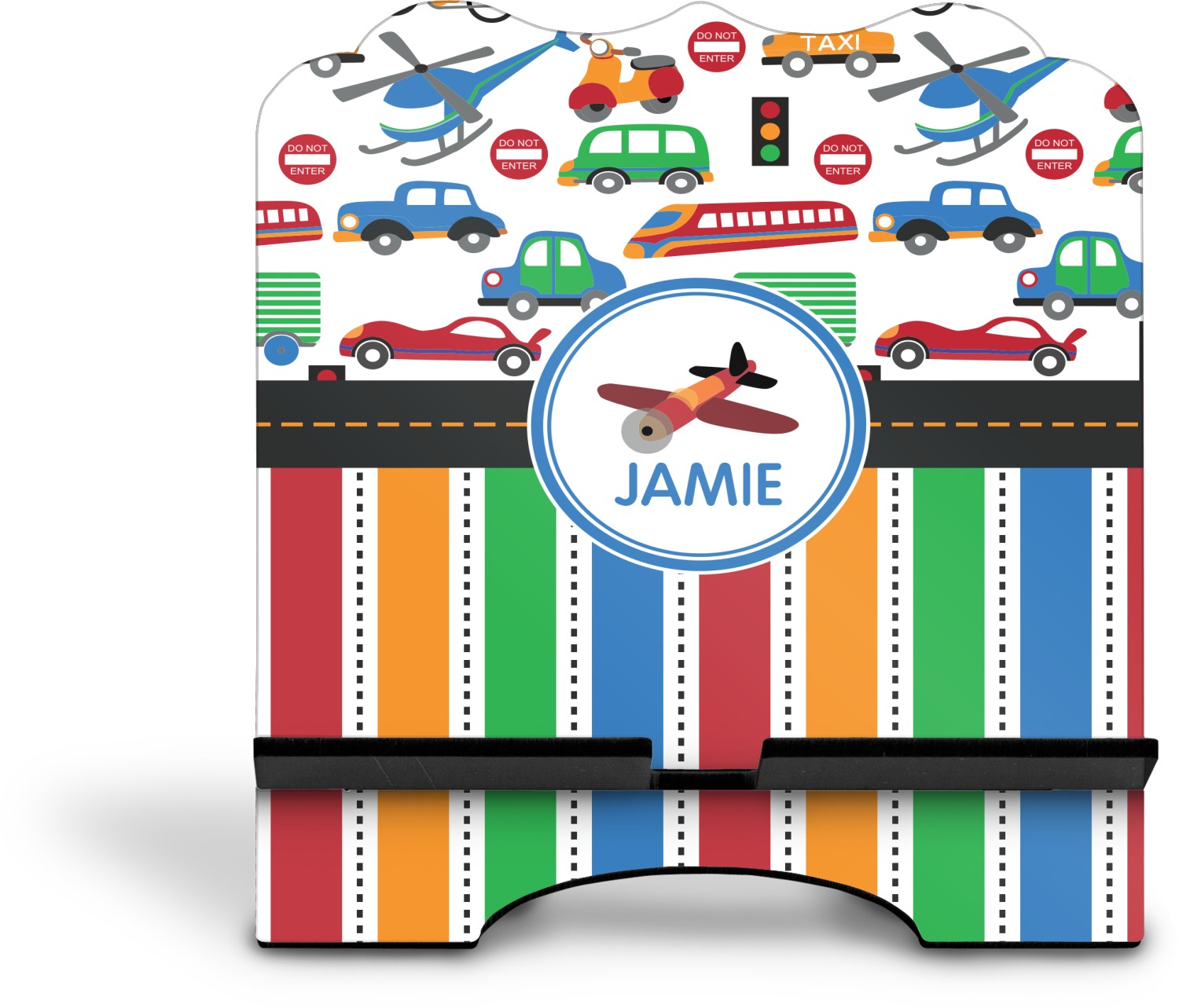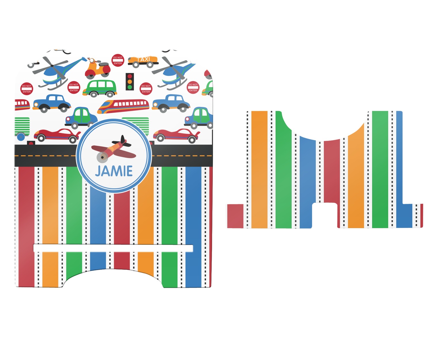 A gray with yellow "road" band ties the two patterns together. A blue and white circle label showcases the airplane and allows for personalization of your choice underneath. You can customize further by picking any of the transportation pictures in the pattern to place in the label. Just let us know what you want.
