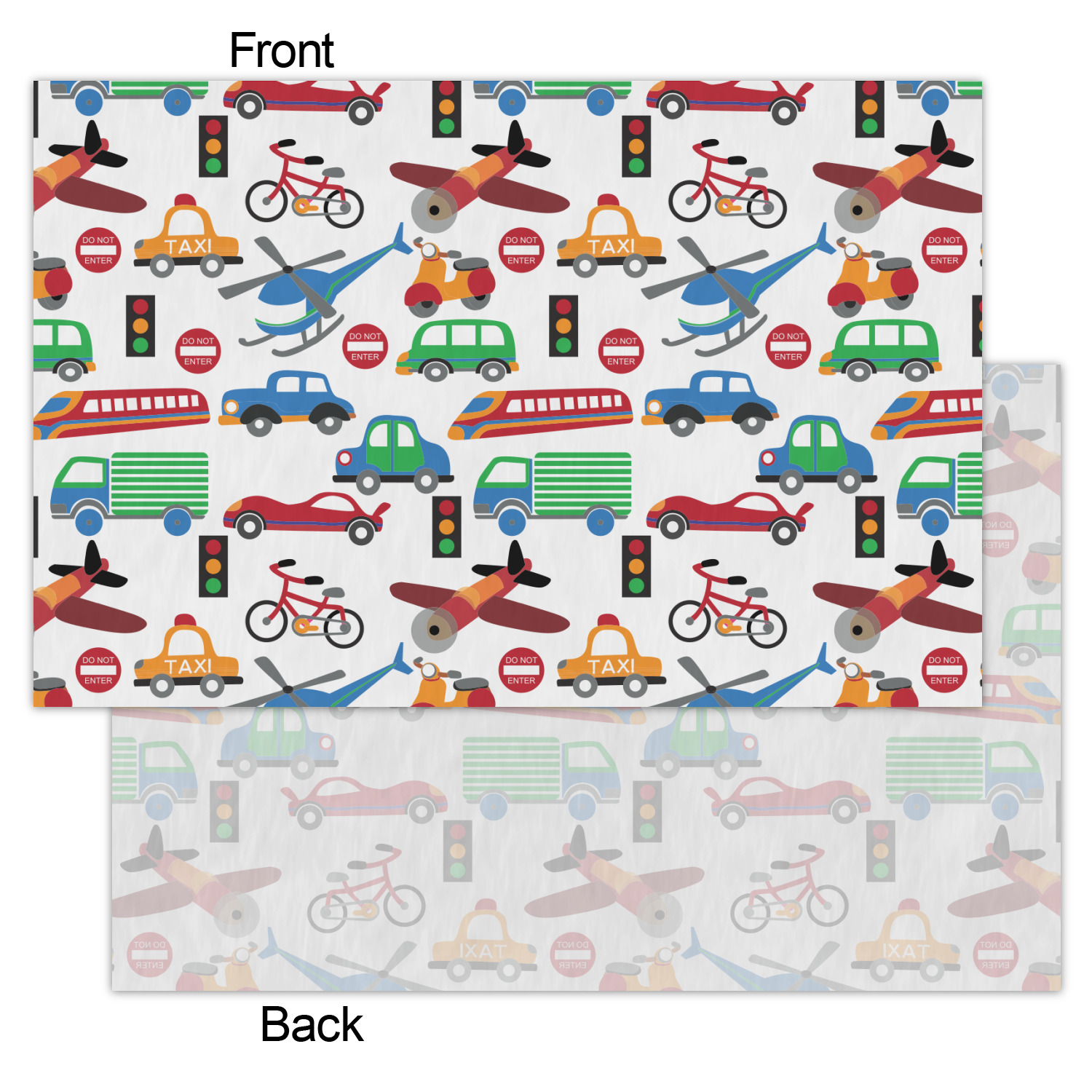 A gray with yellow "road" band ties the two patterns together. A blue and white circle label showcases the airplane and allows for personalization of your choice underneath. You can customize further by picking any of the transportation pictures in the pattern to place in the label. Just let us know what you want.