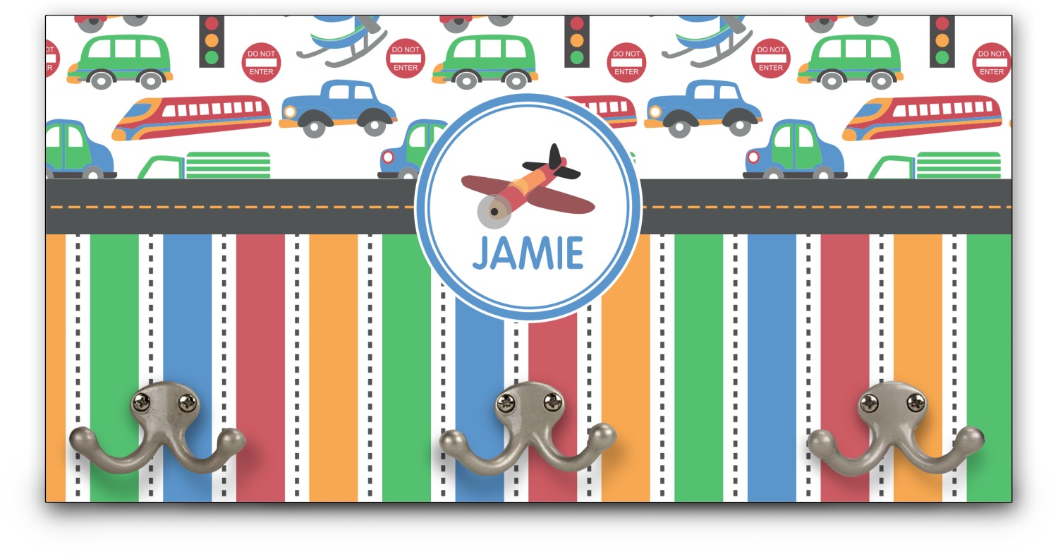 This coat rack is the perfect way to add some personality to your wall or entryway. The board is made of a strong maple that is approximately 16" x 8". The three 2-prong hooks are a sturdy metal that have three screws attaching them to the board. Your design is printed right onto the front of the board while the back and sides are a simple black.