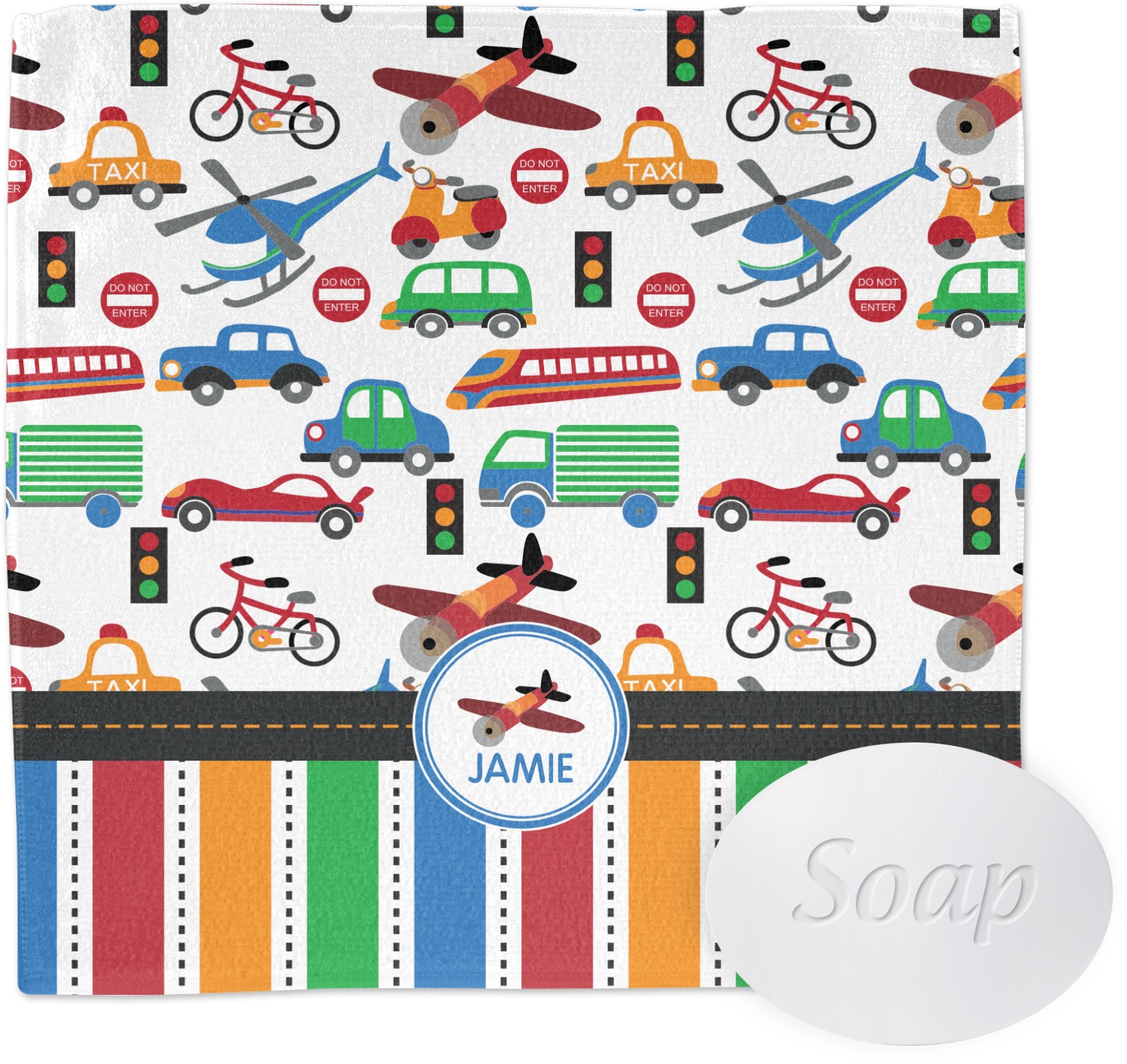 A gray with yellow "road" band ties the two patterns together. A blue and white circle label showcases the airplane and allows for personalization of your choice underneath. You can customize further by picking any of the transportation pictures in the pattern to place in the label. Just let us know what you want.