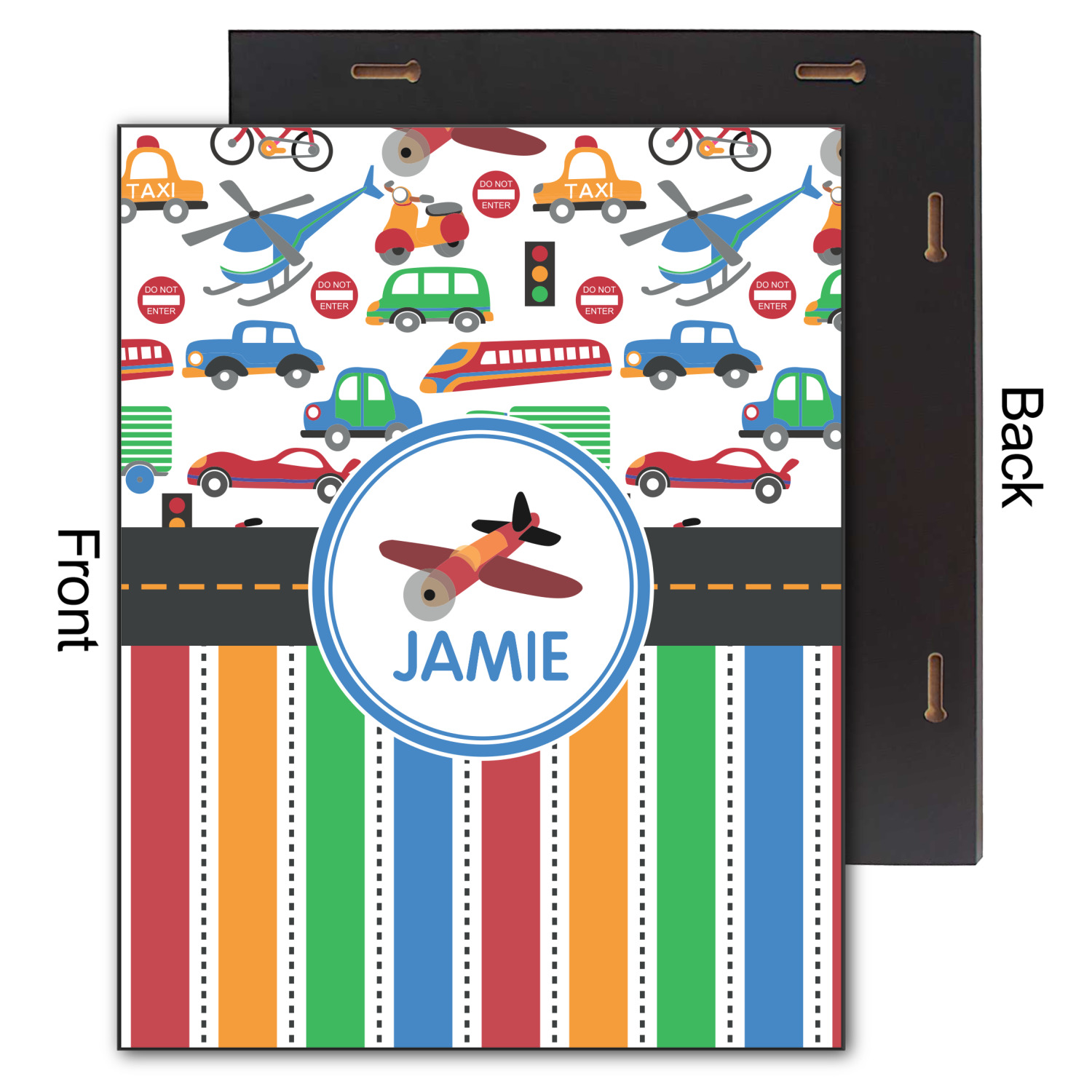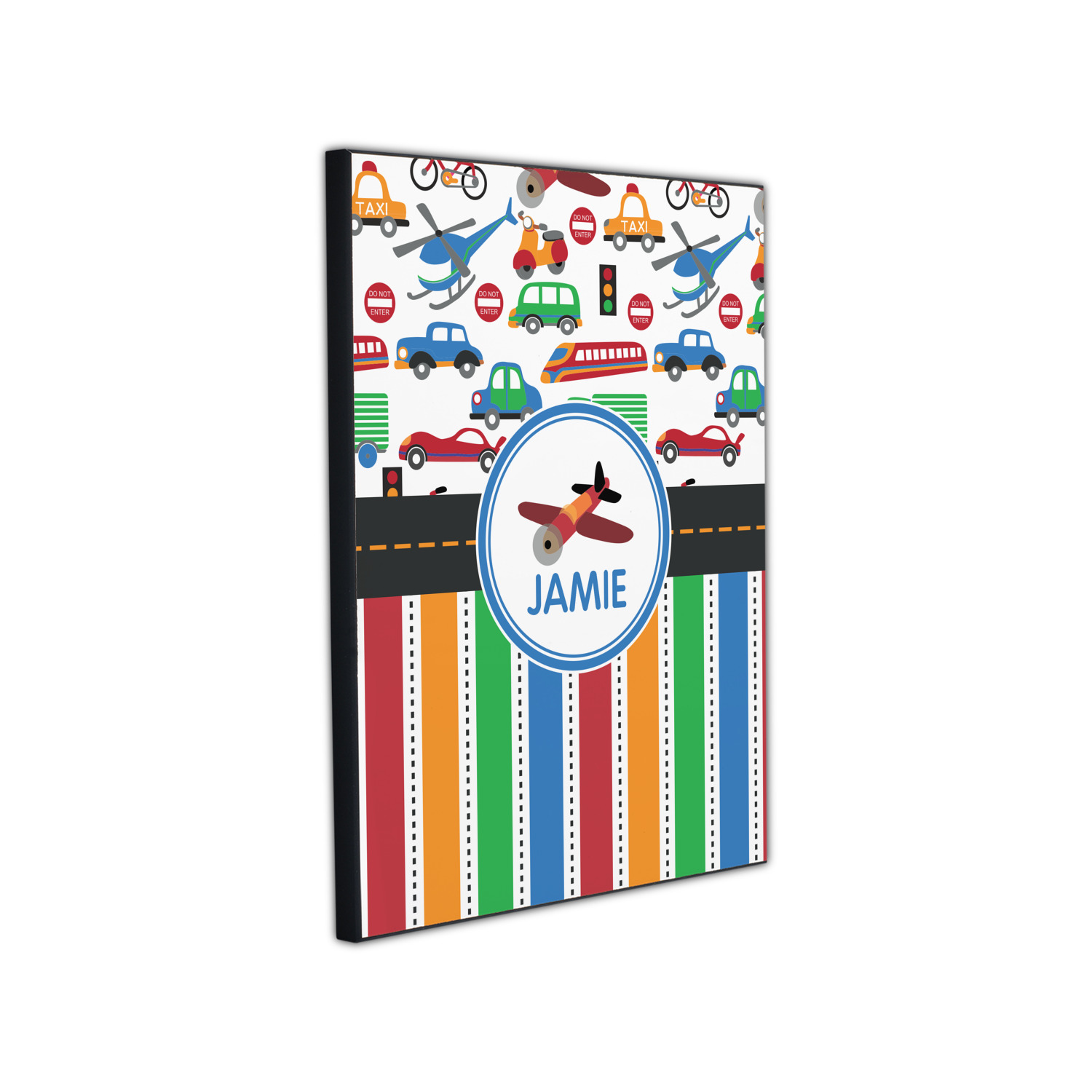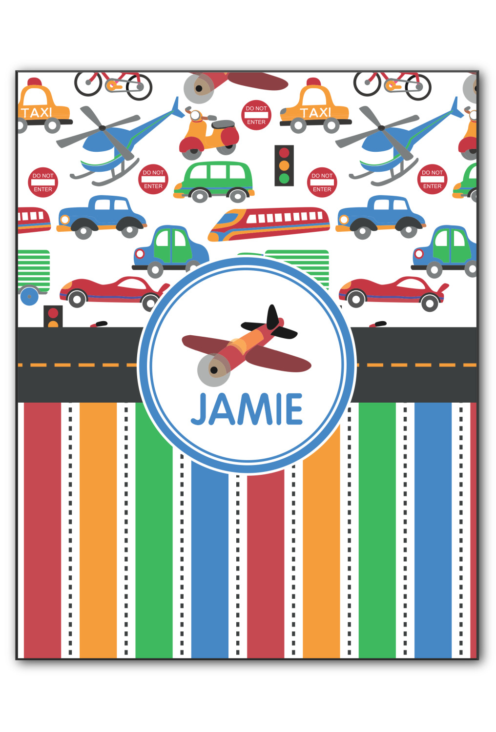 A gray with yellow "road" band ties the two patterns together. A blue and white circle label showcases the airplane and allows for personalization of your choice underneath. You can customize further by picking any of the transportation pictures in the pattern to place in the label. Just let us know what you want.