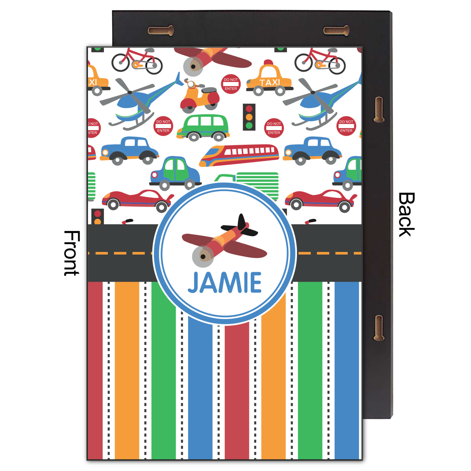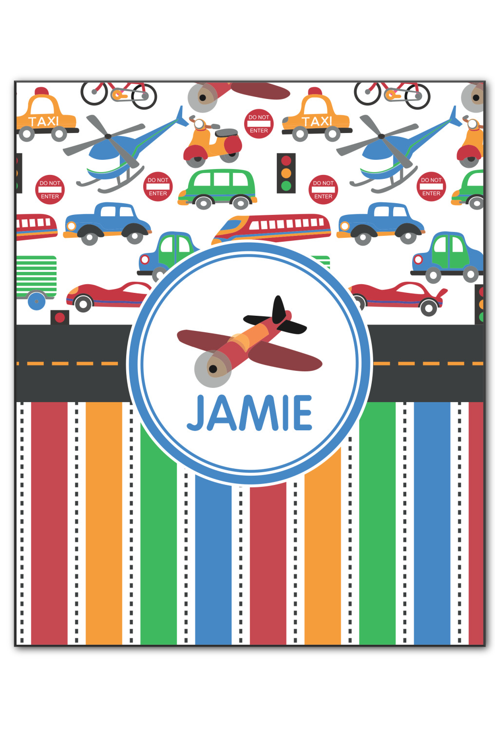 A gray with yellow "road" band ties the two patterns together. A blue and white circle label showcases the airplane and allows for personalization of your choice underneath. You can customize further by picking any of the transportation pictures in the pattern to place in the label. Just let us know what you want.