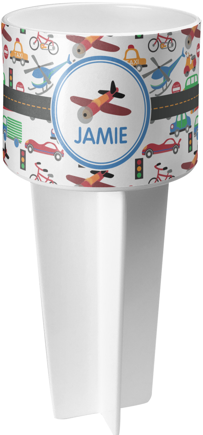 A gray with yellow "road" band ties the two patterns together. A blue and white circle label showcases an airplane with room underneath to add personalization of your choice. You can customize further by picking any of the transportation pictures in the pattern to place in the label. Just let us know what you want.