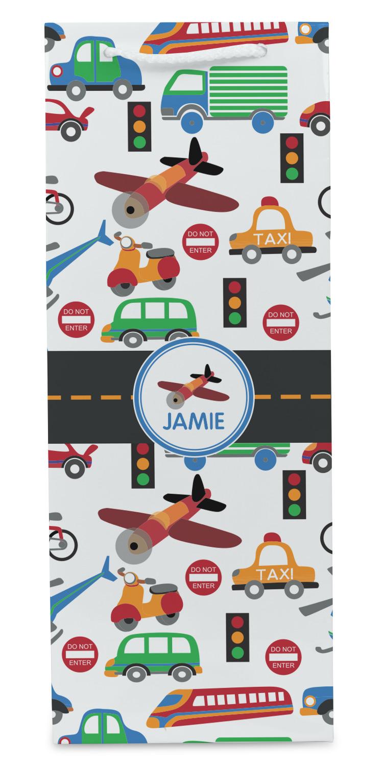 A gray with yellow "road" band ties the two patterns together. A blue and white circle label showcases an airplane with room underneath to add personalization of your choice. You can customize further by picking any of the transportation pictures in the pattern to place in the label. Just let us know what you want.