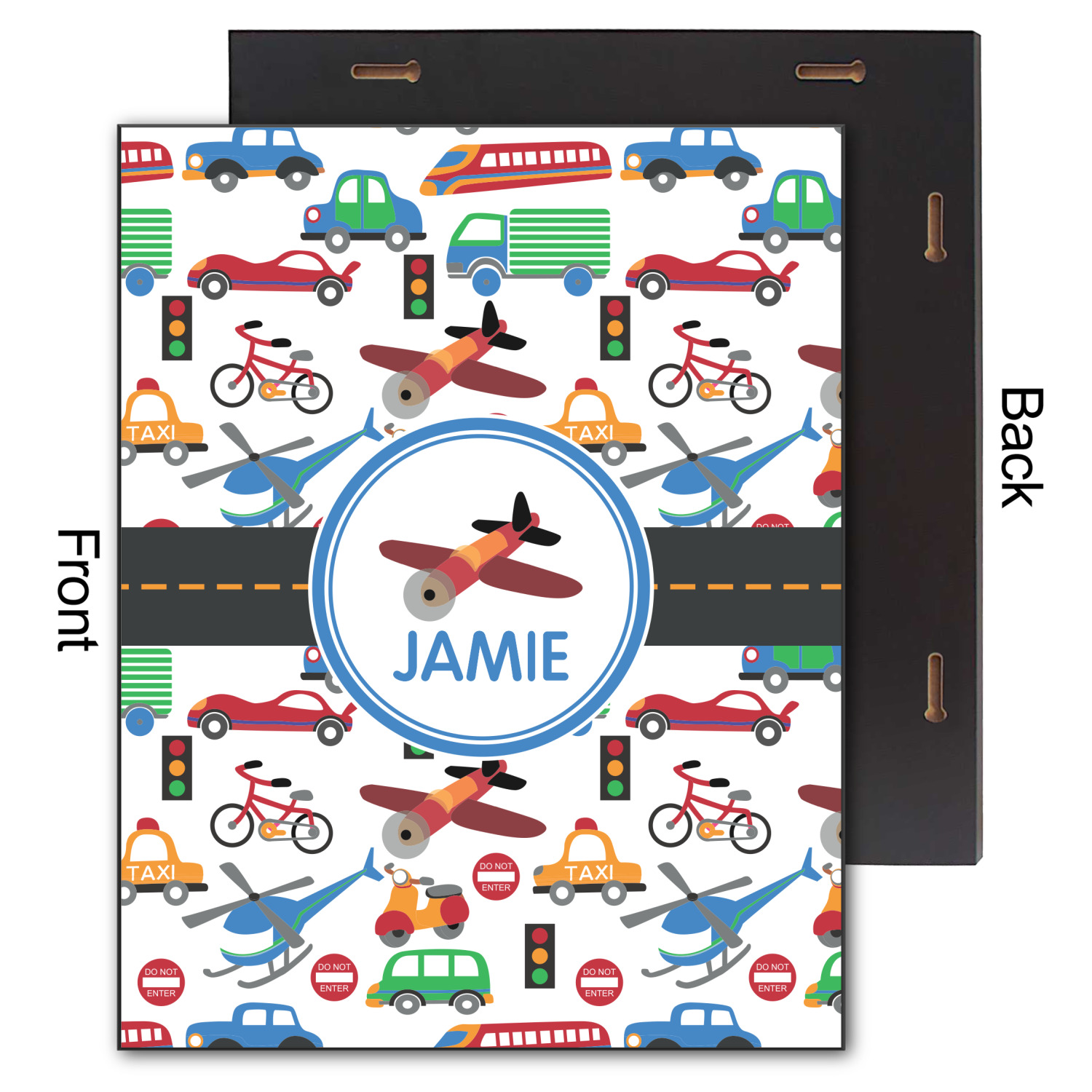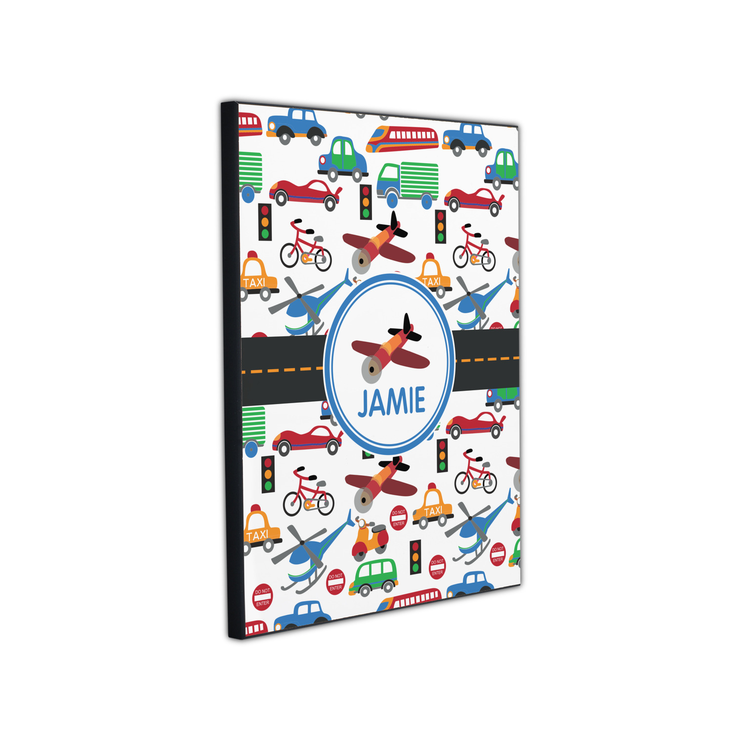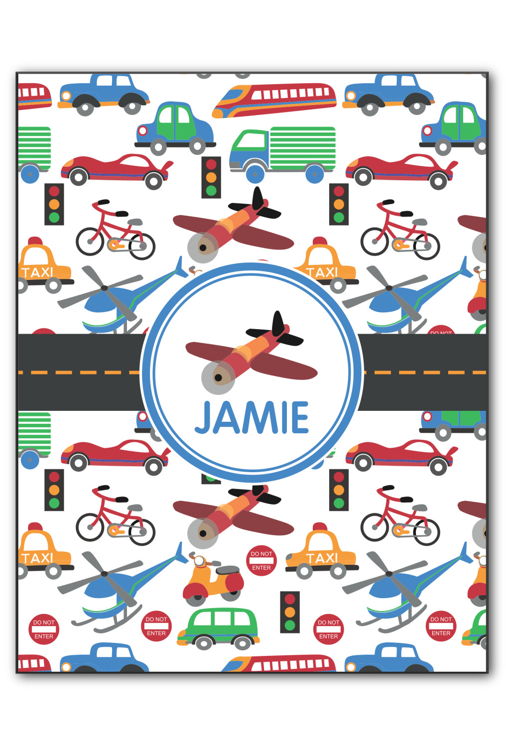 A gray with yellow "road" band ties the two patterns together. A blue and white circle label showcases an airplane with room underneath to add personalization of your choice. You can customize further by picking any of the transportation pictures in the pattern to place in the label. Just let us know what you want.