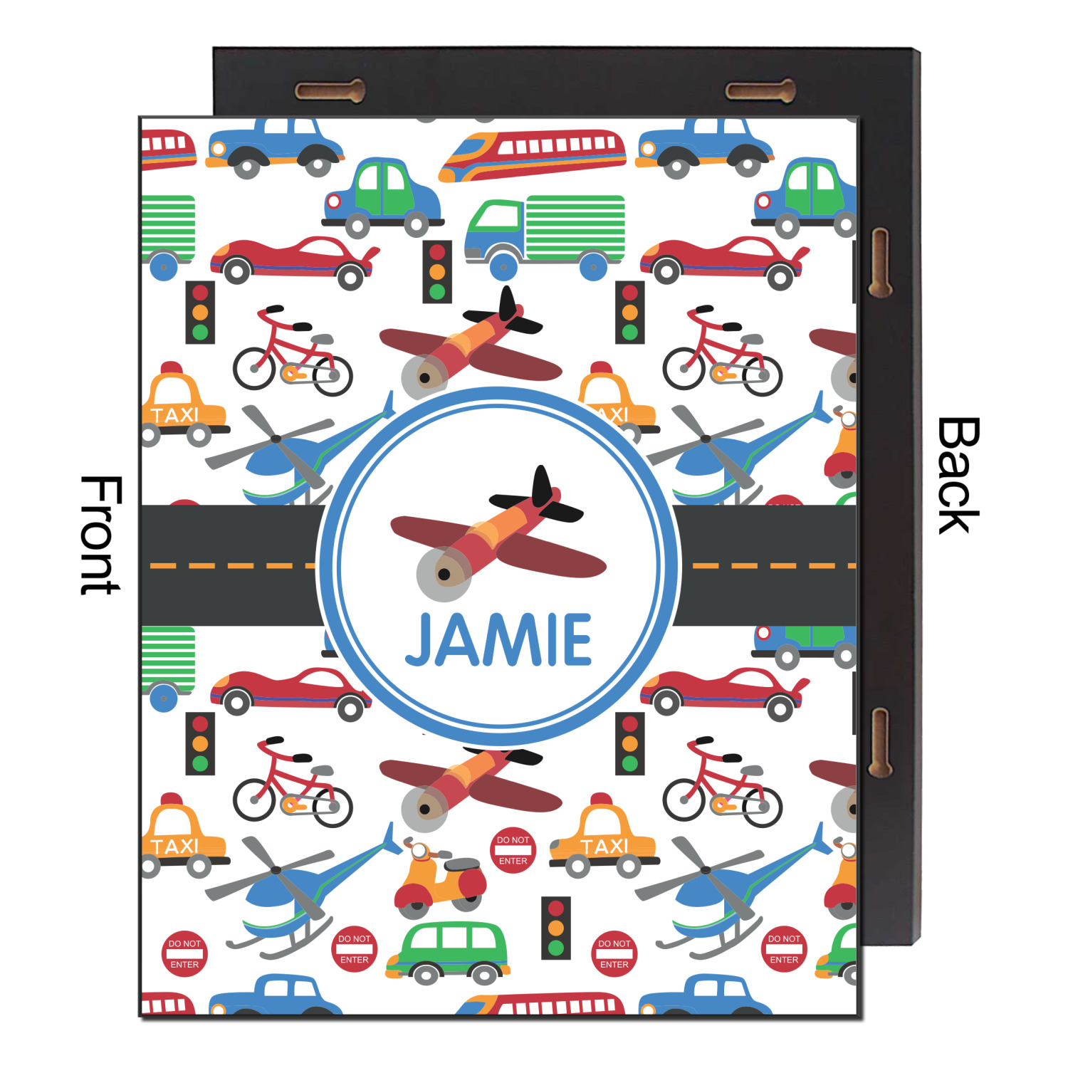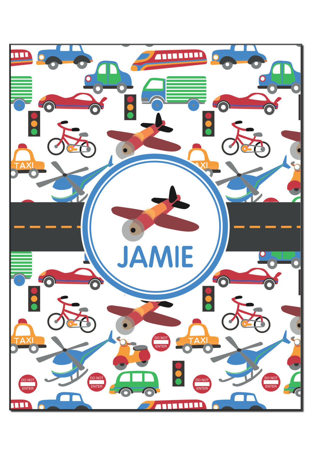 A gray with yellow "road" band ties the two patterns together. A blue and white circle label showcases an airplane with room underneath to add personalization of your choice. You can customize further by picking any of the transportation pictures in the pattern to place in the label. Just let us know what you want.