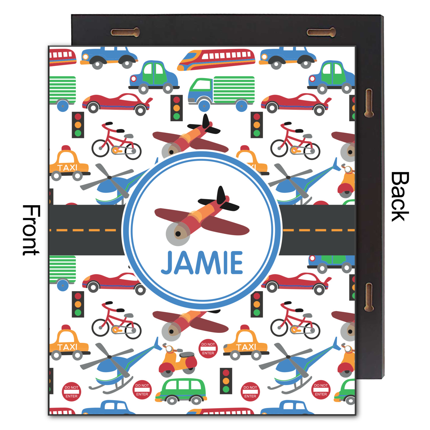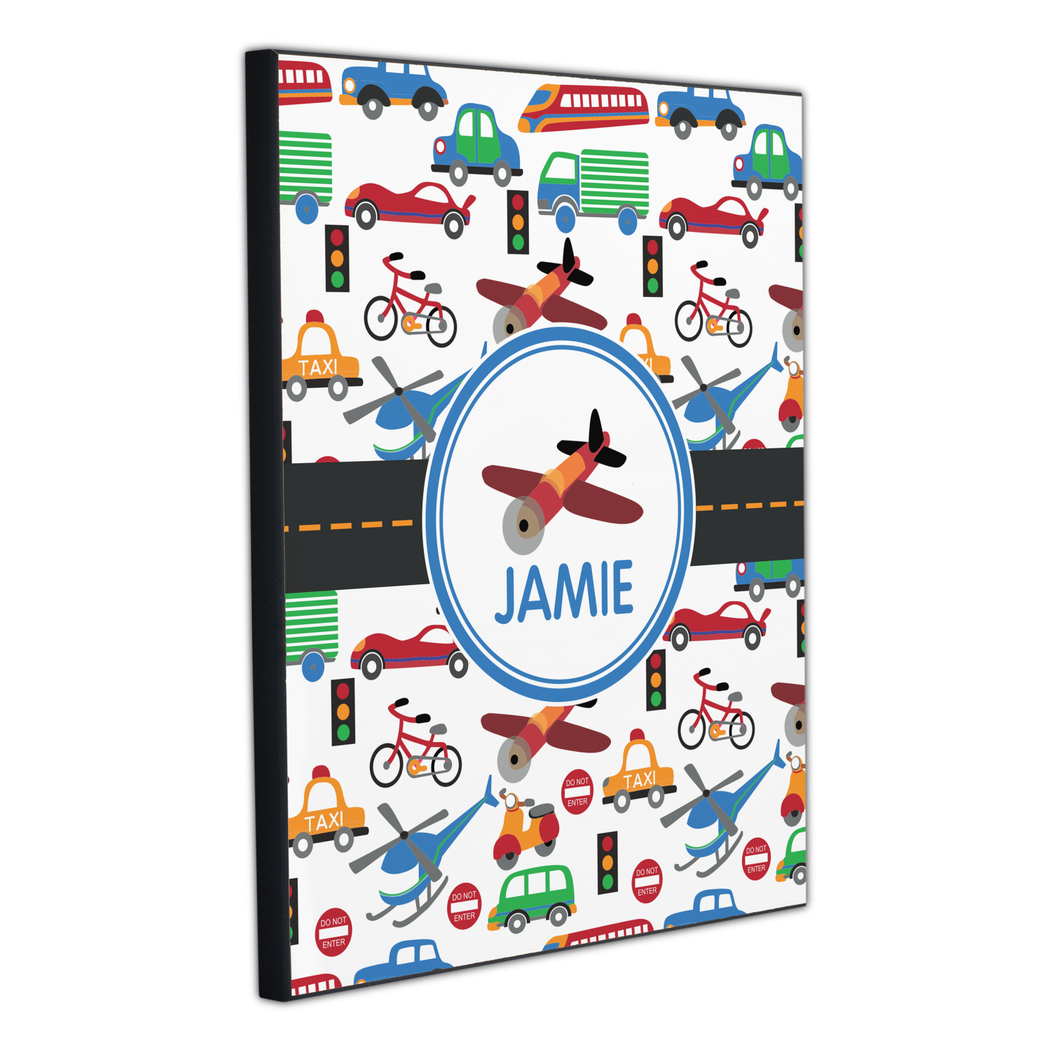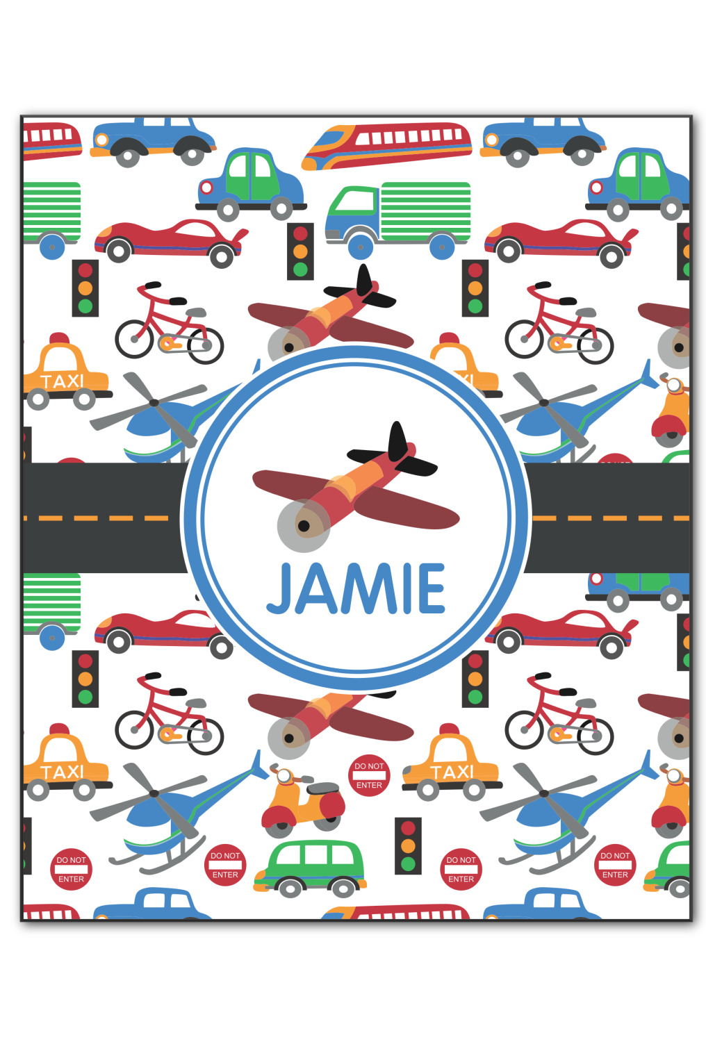 A gray with yellow "road" band ties the two patterns together. A blue and white circle label showcases an airplane with room underneath to add personalization of your choice. You can customize further by picking any of the transportation pictures in the pattern to place in the label. Just let us know what you want.