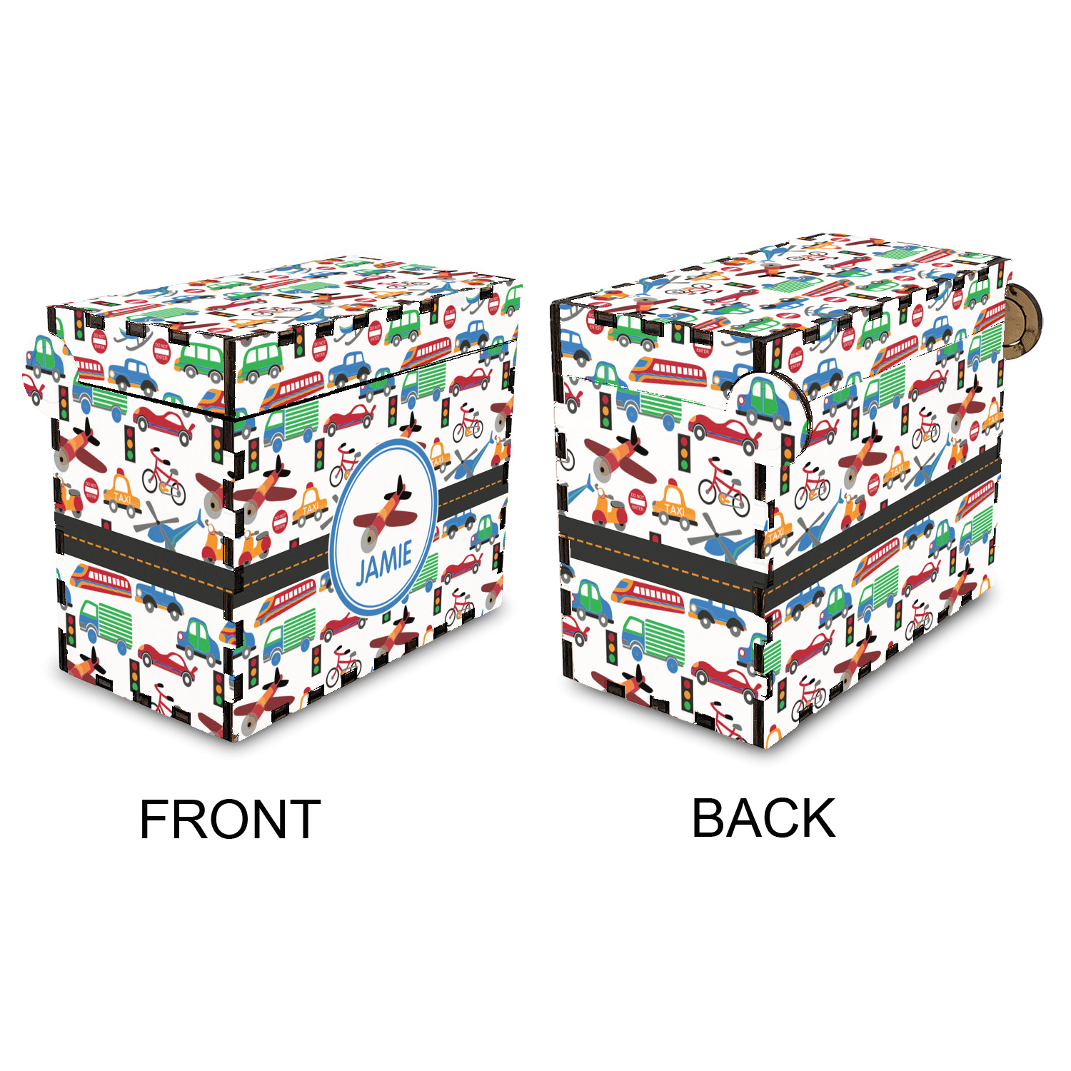 A gray with yellow "road" band ties the two patterns together. A blue and white circle label showcases an airplane with room underneath to add personalization of your choice. You can customize further by picking any of the transportation pictures in the pattern to place in the label. Just let us know what you want.