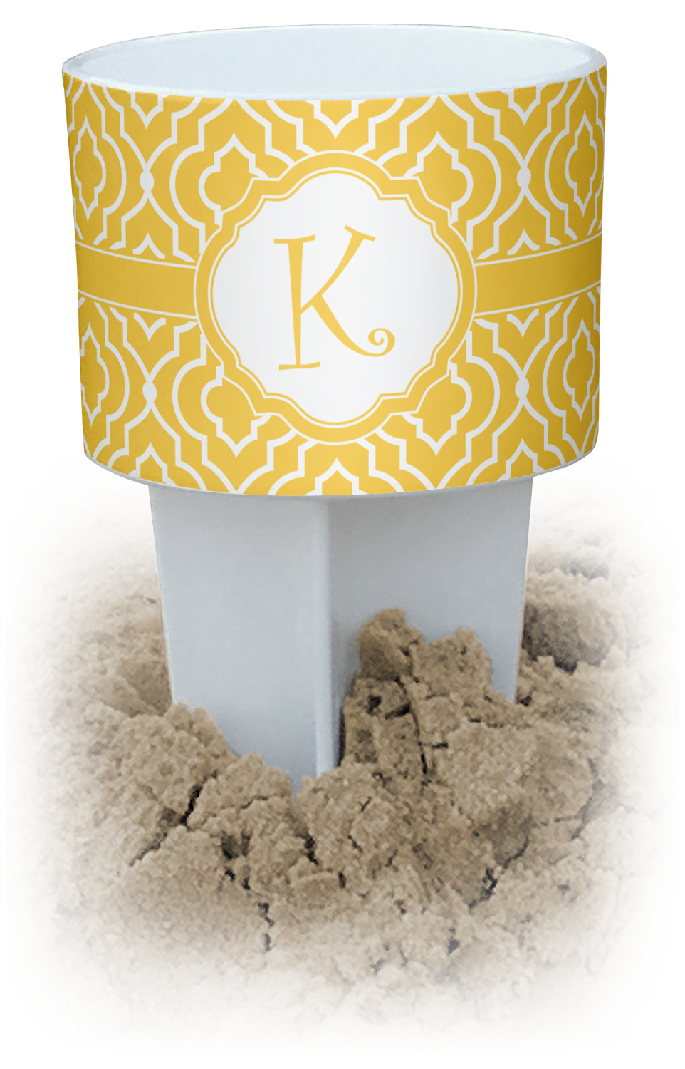 This cup holder has a large stake at its bottom that anchors it to the sand or ground below, while the cup holder rests above the stake. The entire drink holder is made of durable plastic and displays your customization around the cup holder portion. We sell these personalized beach spikers in two different colors: black and white.