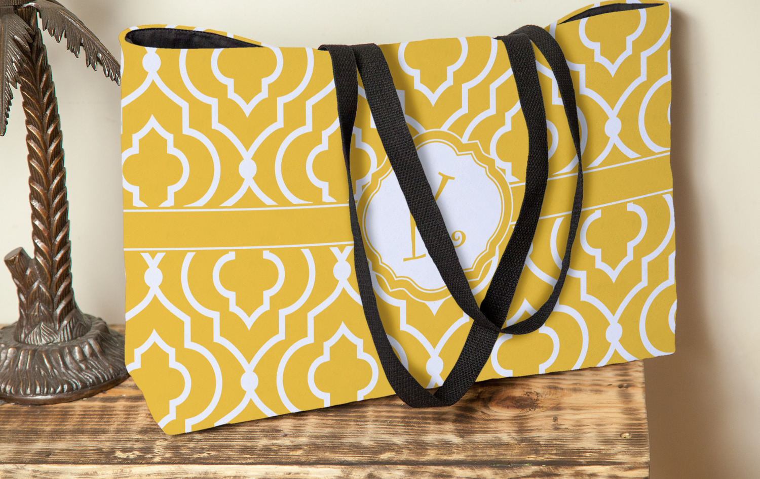 These beach totes are handmade here in the USA. Fabric is printed with your design. The tote is then sewn from the fabric pieces, lining and handles added.