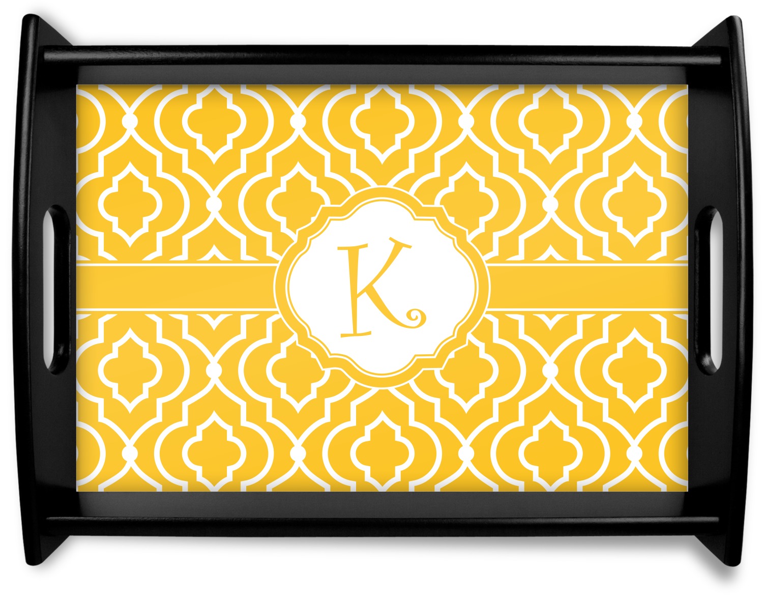 This serving tray with handles features square edges and two rounded sides, creating a very modern look. Each side is fabricated from a beautifully cut, natural wood. The bottom of the interior of the tray displays your customized design in bright, vibrant color. The tray is sold in both a black color and a natural wood look. Each variation of the wood serving tray has two sizes: Small, which is 14" x 10" x 2.25", and Large, which is 19.5" x 13.5" x 2.75".
