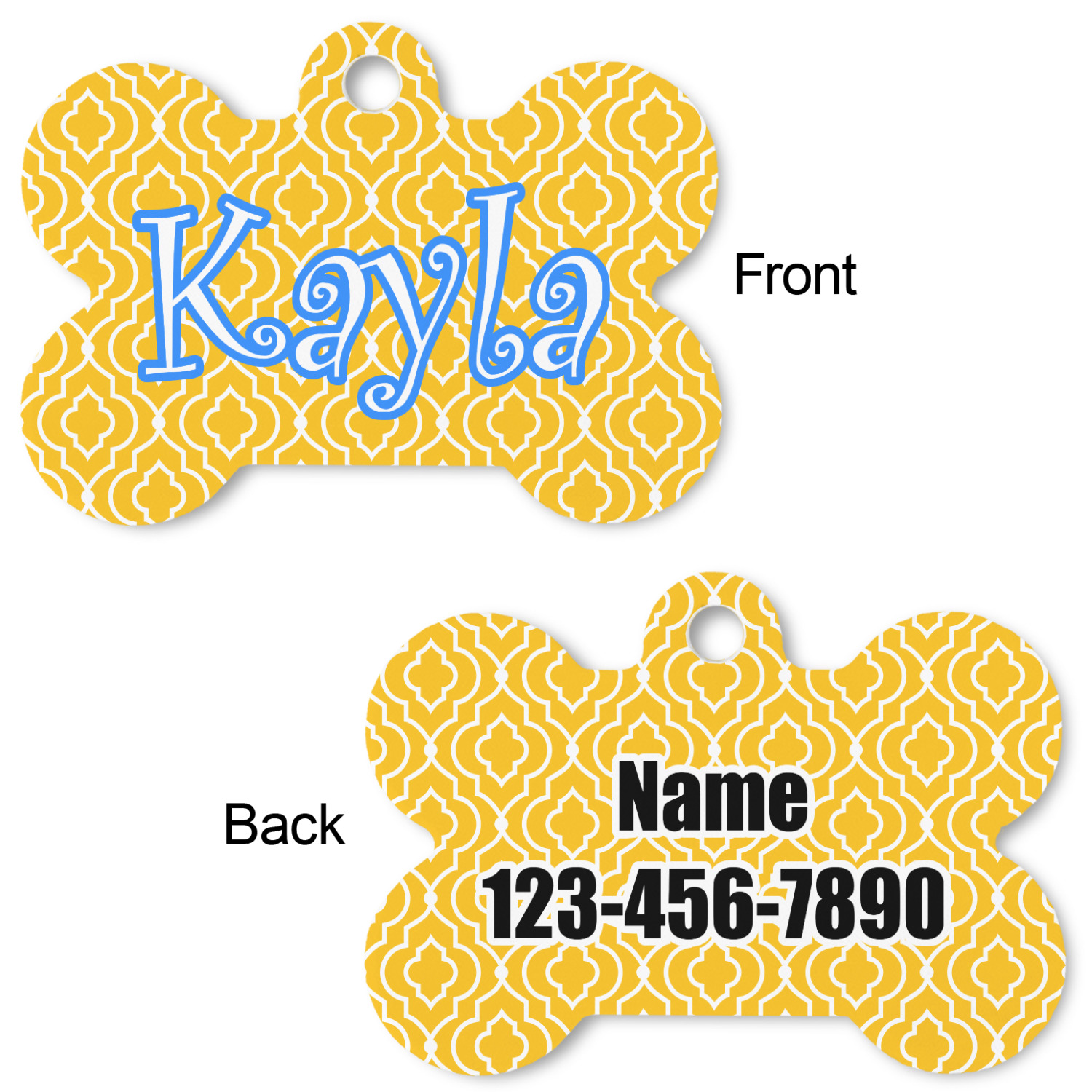 Our default design templates print your dog's personalization on the front and your contact information on the back; however everything is customizable, so you customize the patterns, the colors, the personalization, the contact information etc.