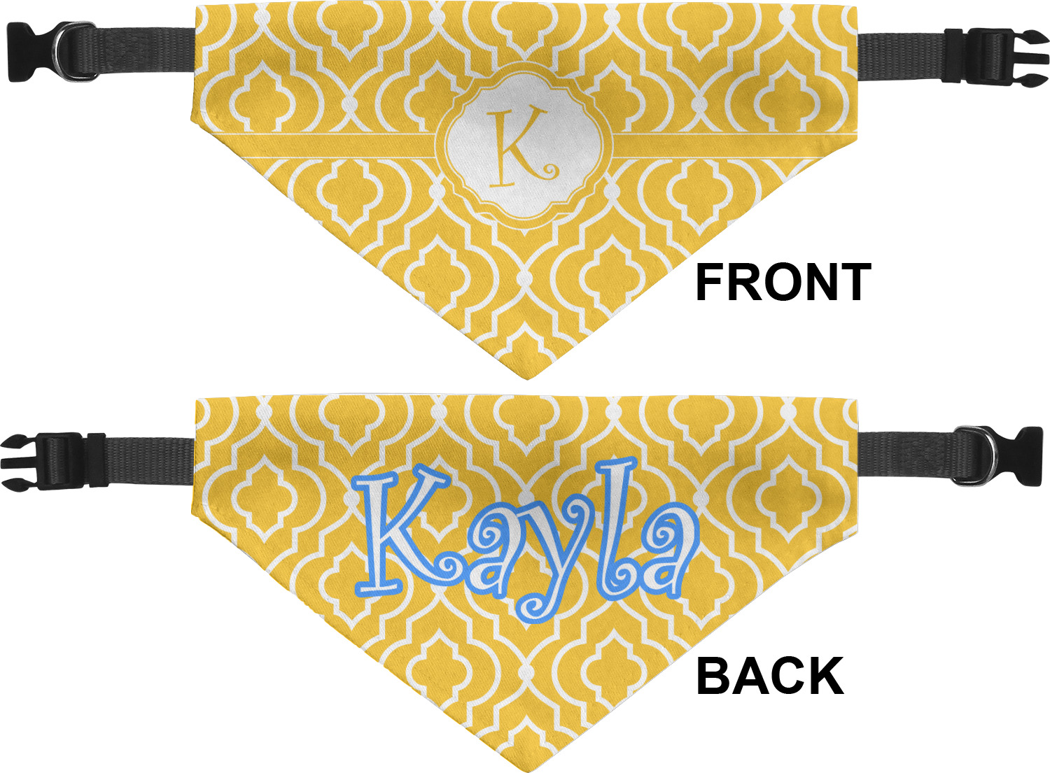 We print the front and back of these dog bandanas with your customized design. The bandana itself is made from a durable polyester, sewn together with a gap large enough to accommodate any collar. Regardless, the bandana includes a plain black, canvas collar with plastic snaps, that can easily be removed if desired. These dog bandana collars are available in four sizes: small, medium, large, and extra large. Please see our sizing chart for more information regarding the dimensions of each size.