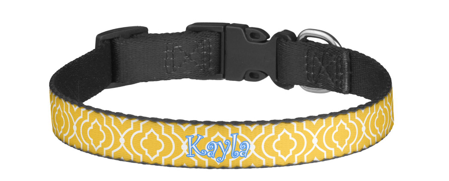 This sturdy collar, made from a durable nylon weave, will outlive your dog's episodes of excited tugging and pulling. Courtesy of its thick plastic buckle and adjuster, this collar is adjustable and accommodating of any dog. Structurally, the collar is a single piece of nylon weave that is sewn together, and features a solid metal loop where you can attach a leash or dog tag. We print and display your dog's name and pattern across the middle of the personalized dog collar.