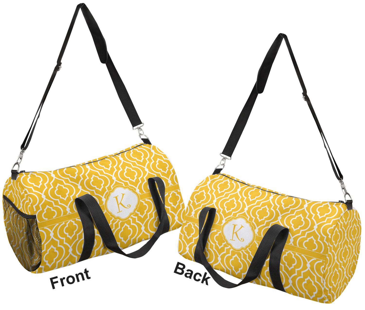 This duffle is a sturdy bag made of a canvas material. It comes in two sizes: Small (19"W x 9.5"H x 9.5"D) and Large (23"W x 12"H x 12"D). The bag is a cylindrical shape with a black adjustable strap and two handles. On one side is an elastic pouch to put a waterbottle or other small item. Your product will be sublimated with your design and is able to be designed on the front, back, and sides. Be sure to remember that the straps may cut into parts of your design if you upload your own artwork.