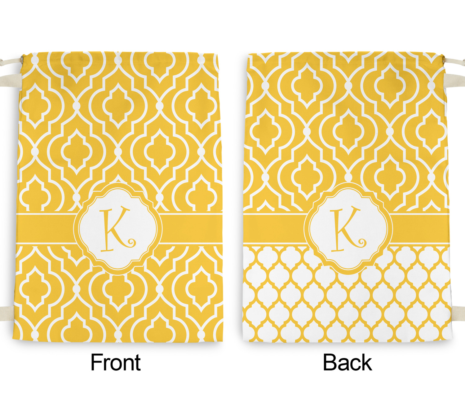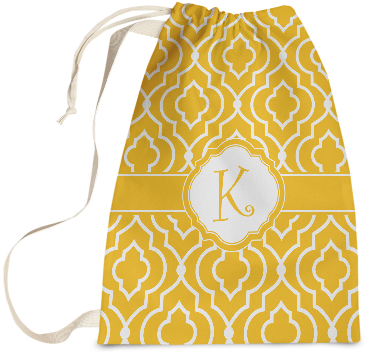 Carry your laundry in style with these customized laundry bags. Available in two sizes, featuring a natural colored woven strap and a cinch cord, these bags hold a lot of clothes or anything else you want to fit in them.