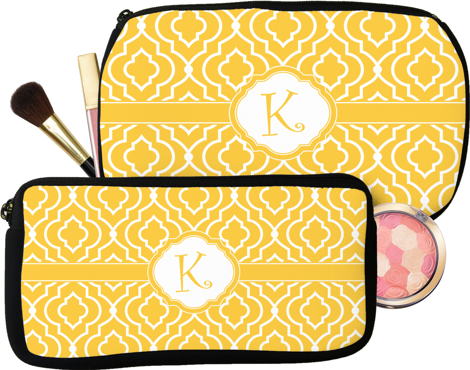 Our personalized makeup bags are available in many different designs, patterns and colors - so you are sure to find one that will love. They are made of neoprene (same material as wet-suits) and thus are water resistant, so spillages in your makeup bag will not end up all over you purse. They are customized on one side and are black on the other side and the zipper is black as well.