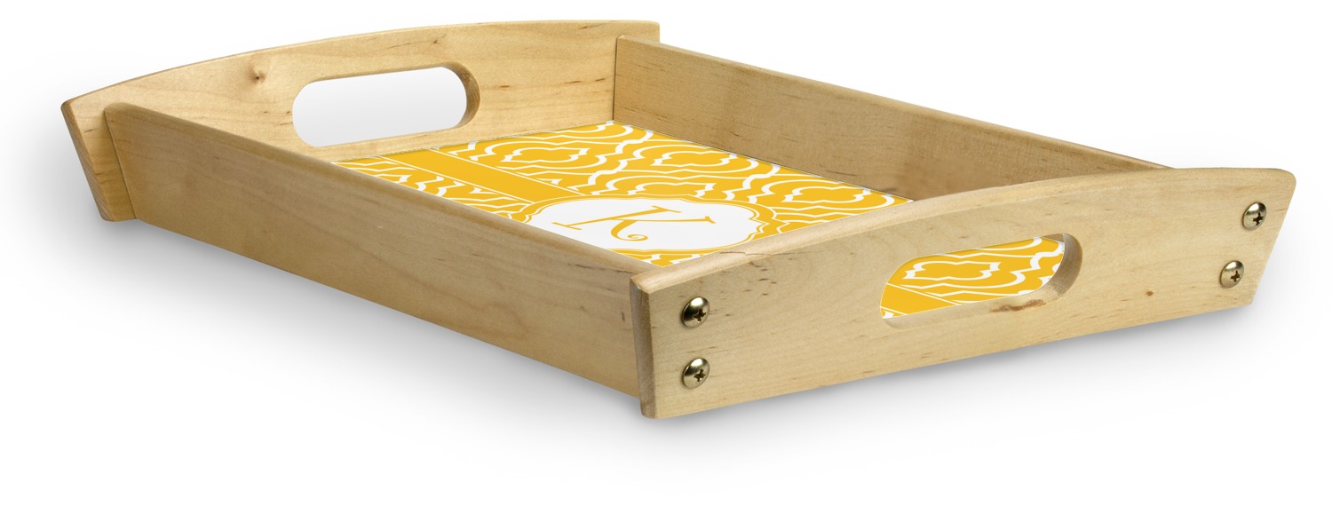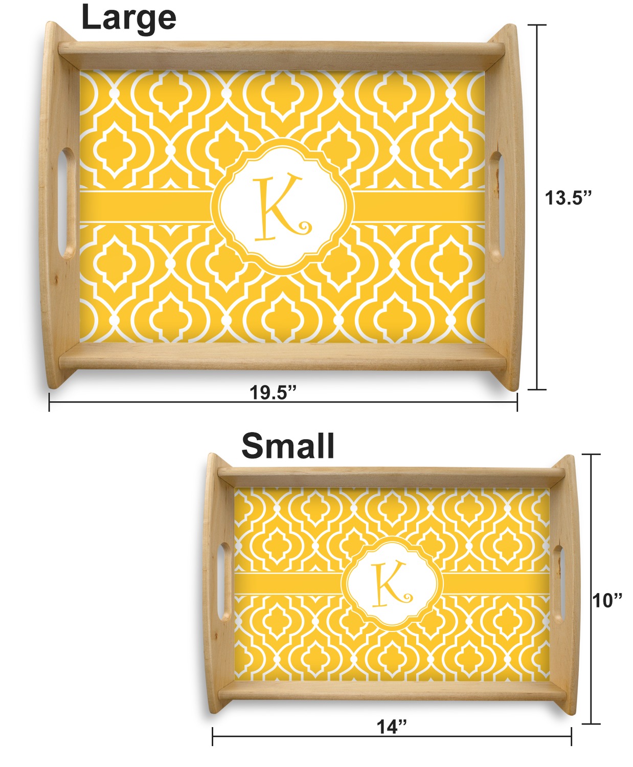 This serving tray with handles features square edges and two rounded sides, creating a very modern look. Each side is fabricated from a beautifully cut, natural wood. The bottom of the interior of the tray displays your customized design in bright, vibrant color. The tray is sold in both a black color and a natural wood look. Each variation of the wood serving tray has two sizes: Small, which is 14" x 10" x 2.25", and Large, which is 19.5" x 13.5" x 2.75".