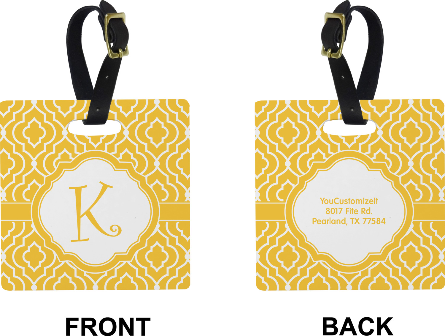 These personalized bag tags are sold in a variety of shapes, so that you may find the product that meets your vision exactly. We sell a round luggage tag, which measures at approximately 4" x 4". Our square luggage tag is about 3.5" x 3.5", while our rectangular version is 2.75" x 4 ".