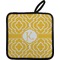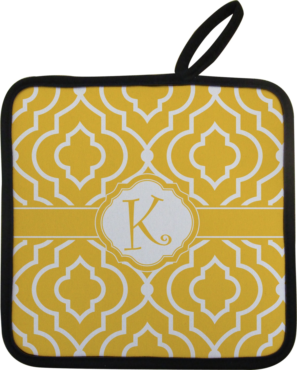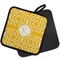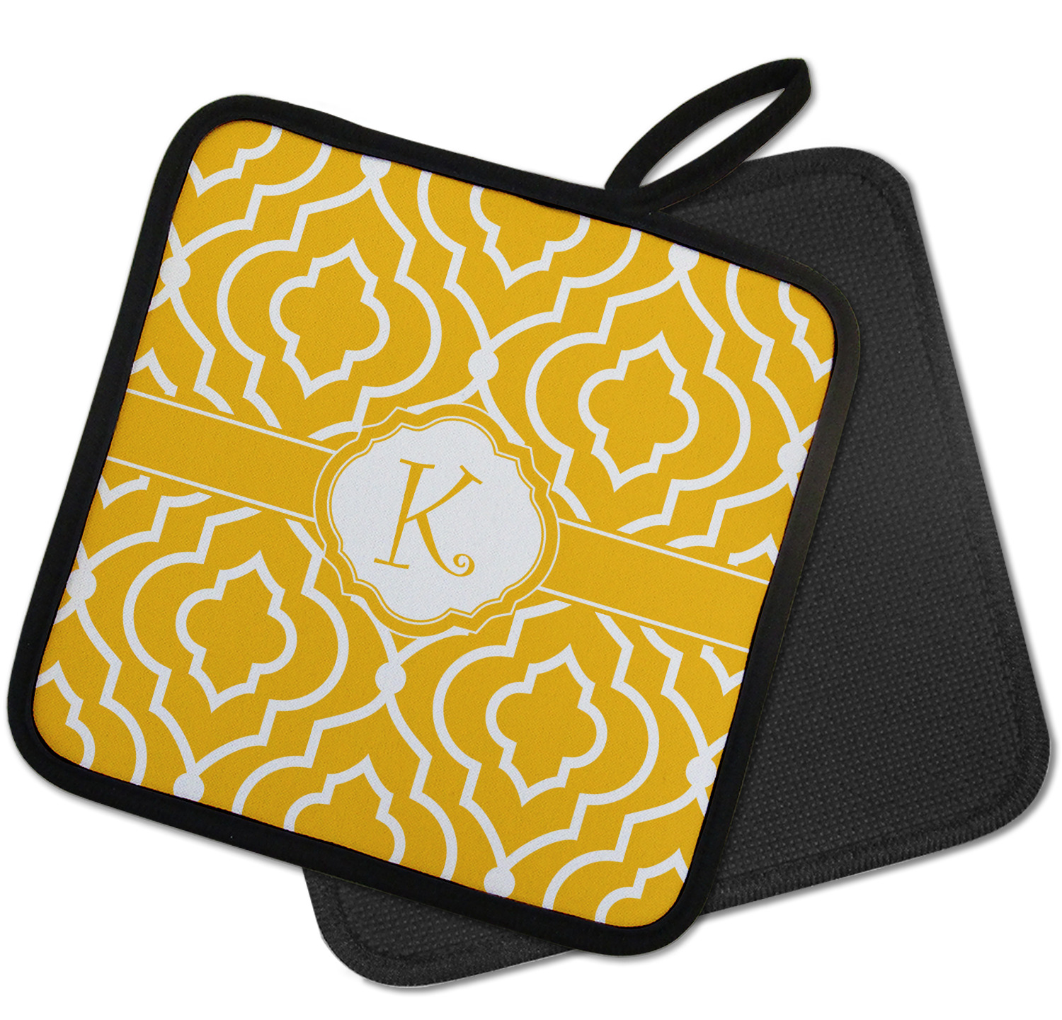 Our personalized pot holders feature a neoprene front that displays your personalization in vibrant colors. The backing of the hot pot holder is rubberized; the textured backing allows you to have a great grip when using this custom pot holder. The two materials are joined with a sleek, black trim, and the holder also includes an attached loop for hanging and storage. The pot holder is approximately 8.75 inches by 8.75 inches and 0.25 inches tall, while the fabric loop is 2.5 inches long. You can purchase a kitchen pot holder by itself or as a set of 2. We also offer a set including one pot holder and one oven mitt.