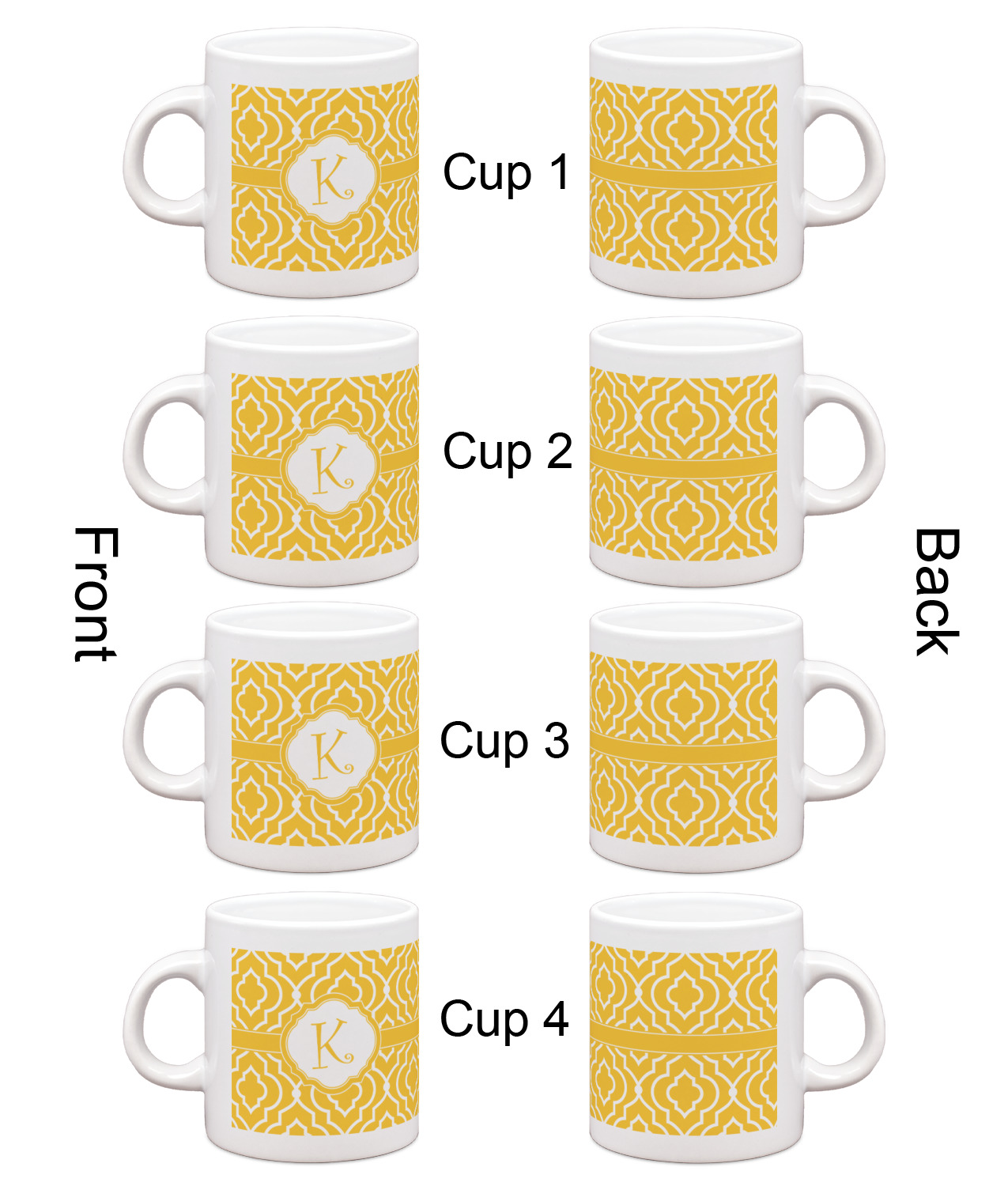Each of our espresso mugs is a ceramic material sure to keep your drink warm. Personalize one cup for yourself, or order a set of 4! Its the perfect little gift for any coffee lover! We carry two sizes for you to personalize - 3 oz. (approx. 3.25" x 2.325" x 2.625") or 6 oz. (approx. 4" x 2.9" x 2.9"). Our 3 oz. mug is perfect for that single shot espresso while our 6 oz. mug can be your next favorite cappuccino cup holding two shots of espresso!