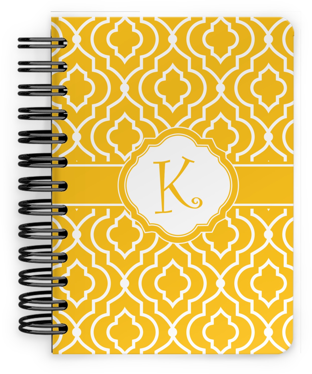 This spiral notebook includes 75 sheets of thick, ruled paper. The front and back of this custom notebook is made of a robust, laminate, plastic covering. We print your personalization on these two panels, underneath a glossy finish, which emphasizes the colors of your design. The two panels and the sheets of paper are held together by a sturdy, black coil. The paper within your bound notebook is perforated for easy, clean tearing.