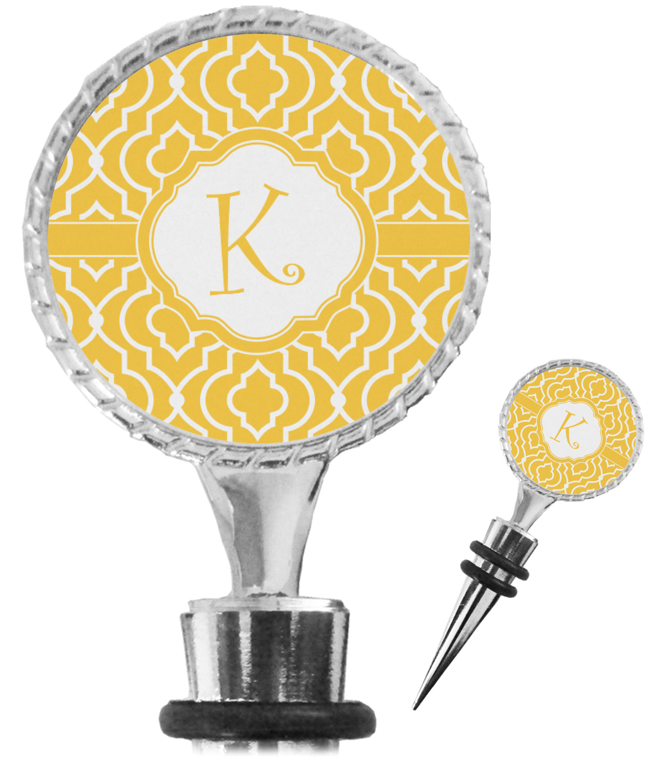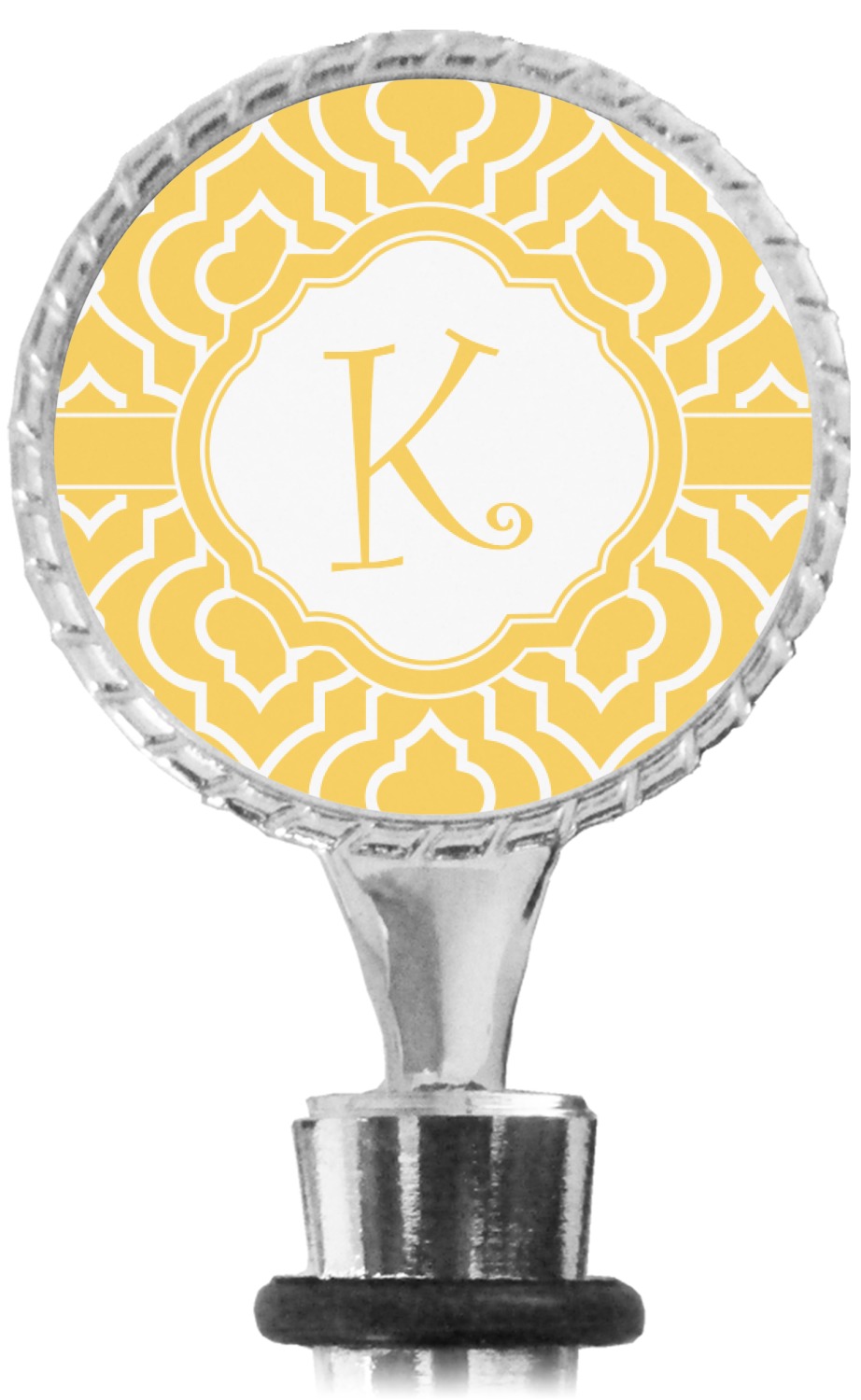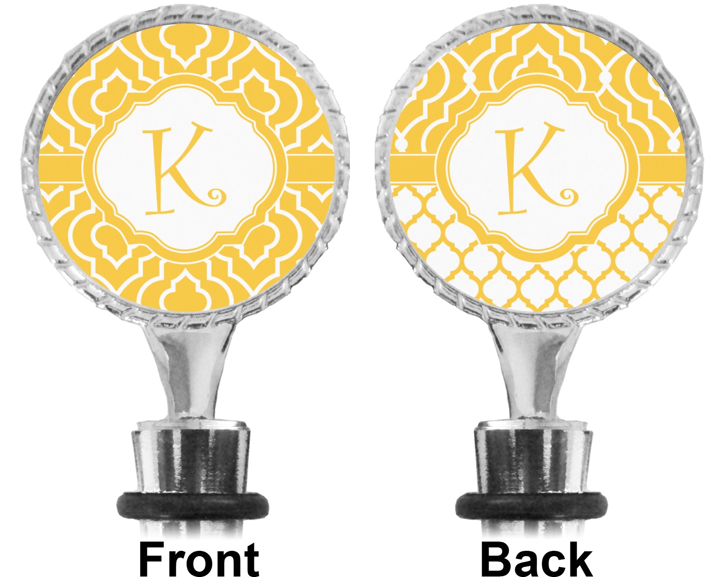 The top part of your bottle stopper is comprised of a zinc ring that displays your customization(s) in its middle, on both sides. The ring is heavy duty, with a bright chrome finish. The body of the wine stoppers have two silicone rings to provide an airtight seal. These wine bottle stoppers measure at 1.625" L x 0.8125" W x 4.625" H; your custom wine stopper is meant to fit into most standard-sized wine bottles.