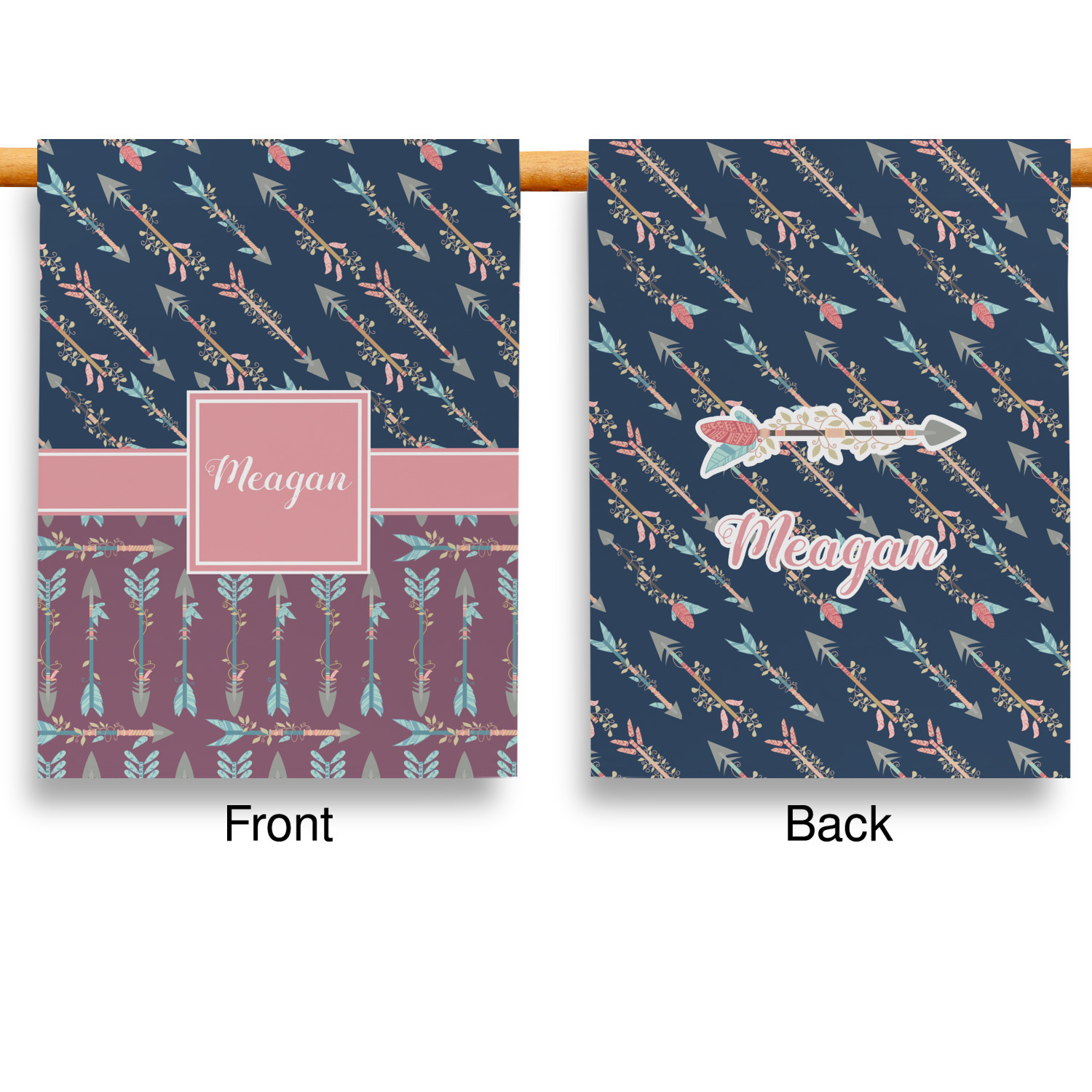 The cool navy blue and mauve really give this design a calming feeling. The two backgrounds have several different kinds of illustrative tribal arrows. Each one has slight variations in its beautiful detail. The soft blush ribbon and frame give a nice accent to both the navy and mauve. Put your very own personalization in the frame to get started.