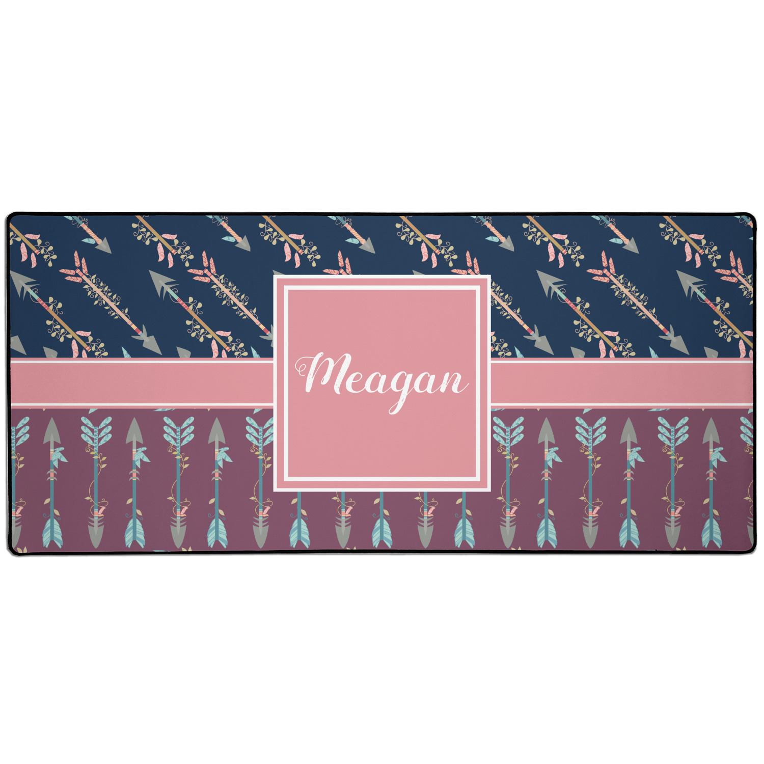 The cool navy blue and mauve really give this design a calming feeling. The two backgrounds have several different kinds of illustrative tribal arrows. Each one has slight variations in its beautiful detail. The soft blush ribbon and frame give a nice accent to both the navy and mauve. Put your very own personalization in the frame to get started.