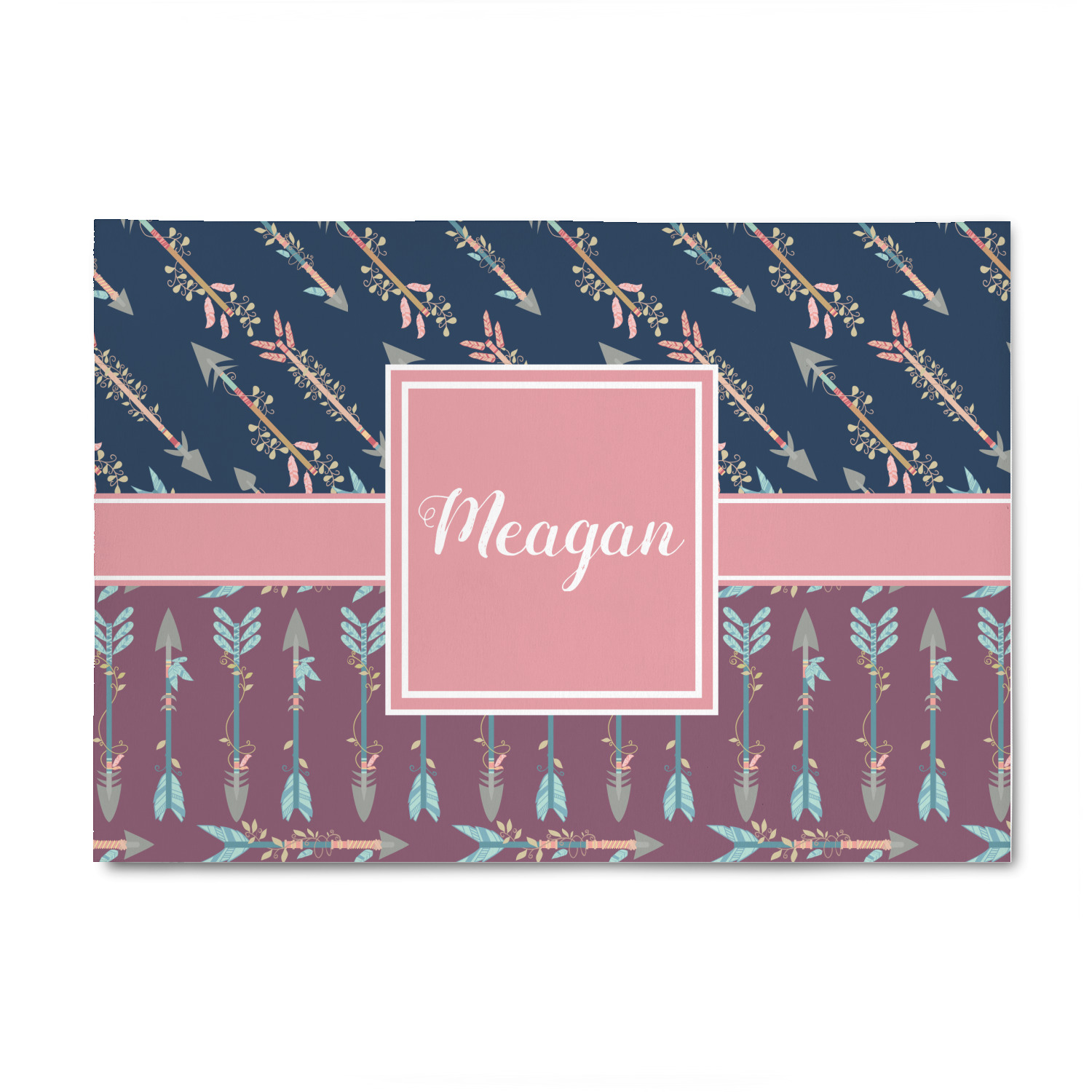 The cool navy blue and mauve really give this design a calming feeling. The two backgrounds have several different kinds of illustrative tribal arrows. Each one has slight variations in its beautiful detail. The soft blush ribbon and frame give a nice accent to both the navy and mauve. Put your very own personalization in the frame to get started.