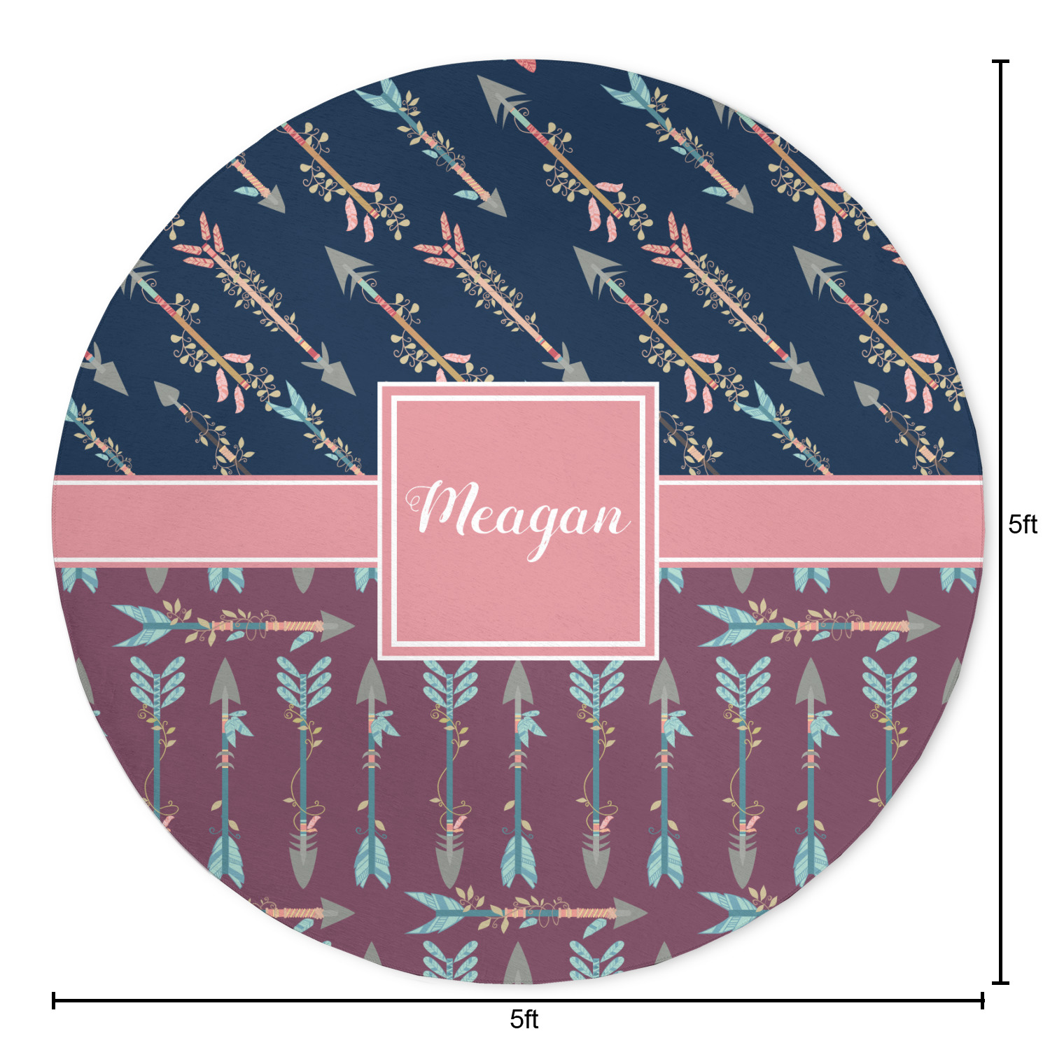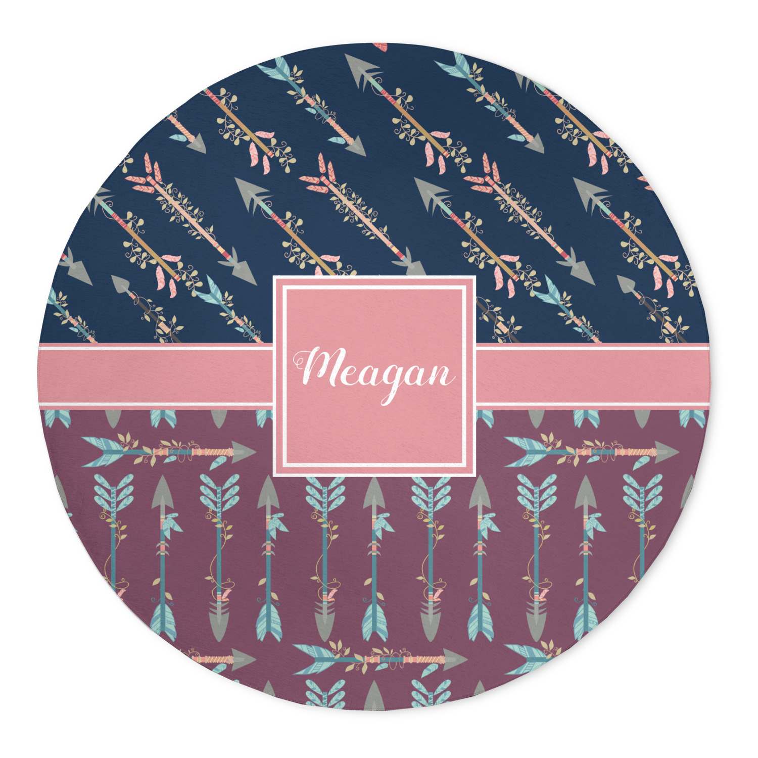 The cool navy blue and mauve really give this design a calming feeling. The two backgrounds have several different kinds of illustrative tribal arrows. Each one has slight variations in its beautiful detail. The soft blush ribbon and frame give a nice accent to both the navy and mauve. Put your very own personalization in the frame to get started.