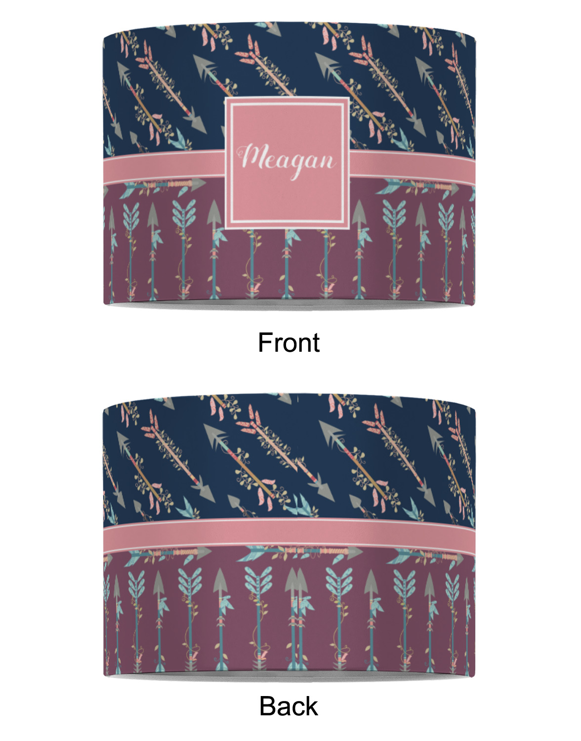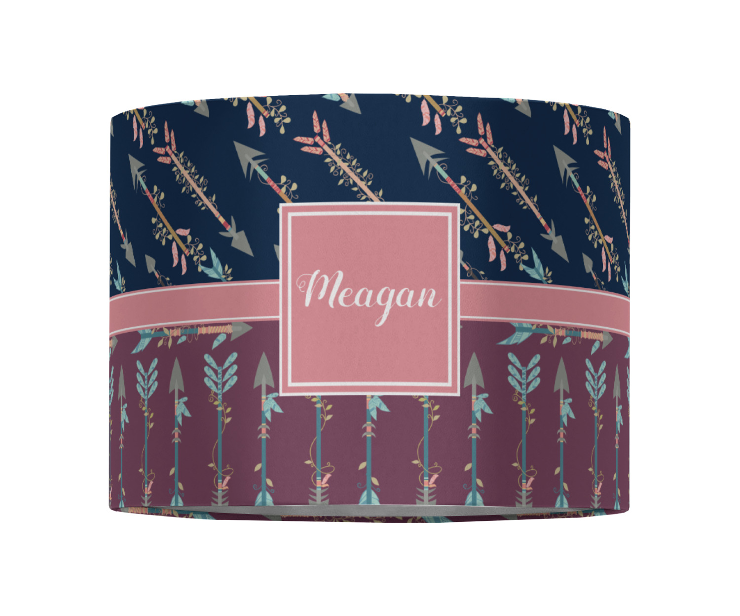 The cool navy blue and mauve really give this design a calming feeling. The two backgrounds have several different kinds of illustrative tribal arrows. Each one has slight variations in its beautiful detail. The soft blush ribbon and frame give a nice accent to both the navy and mauve. Put your very own personalization in the frame to get started.