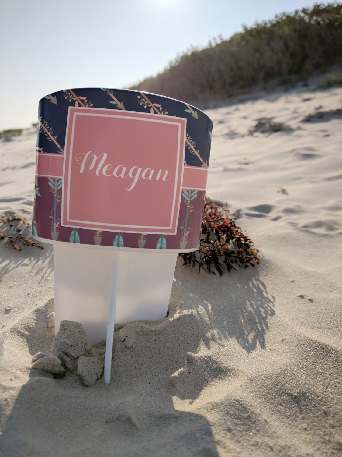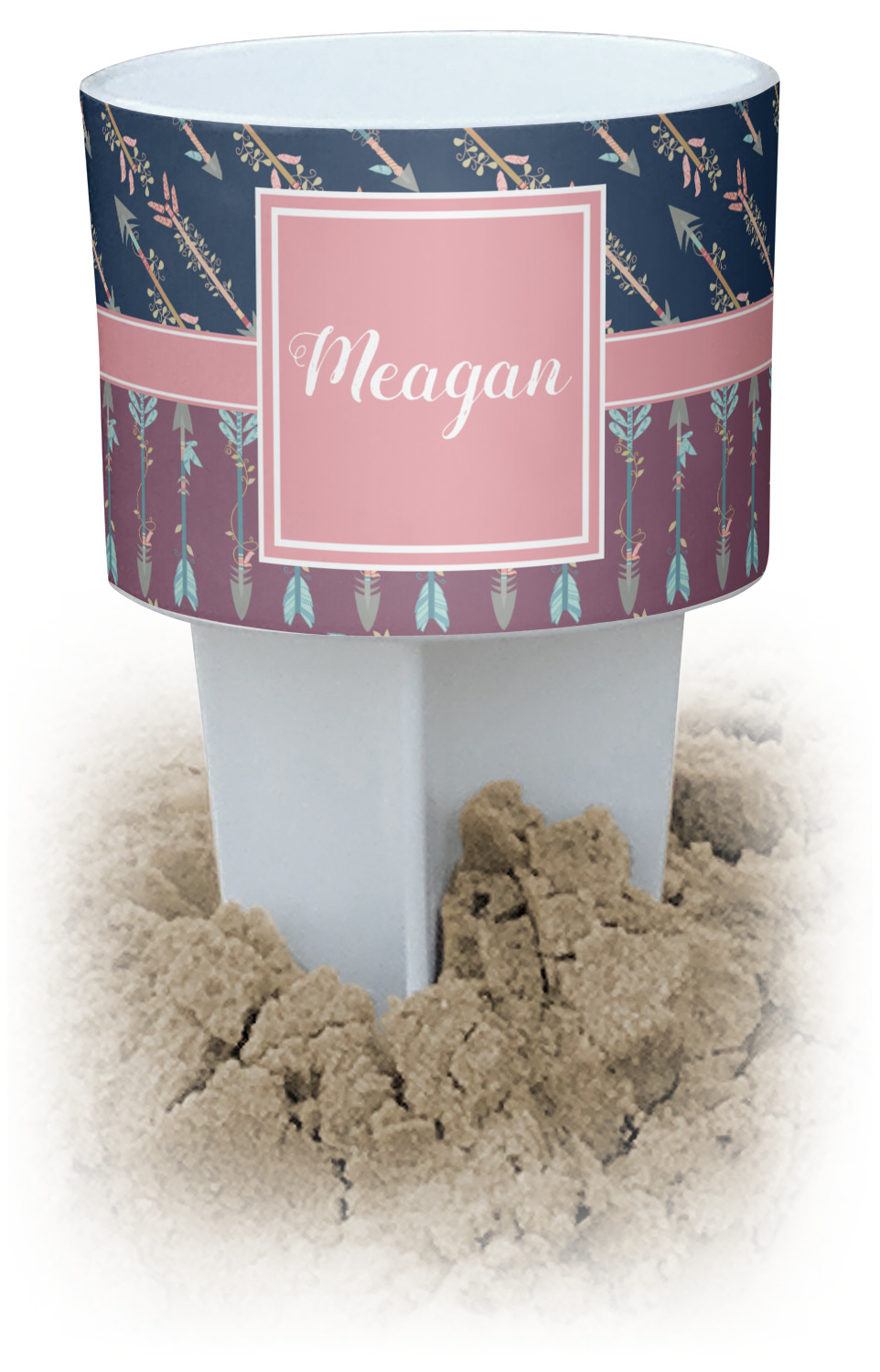 This cup holder has a large stake at its bottom that anchors it to the sand or ground below, while the cup holder rests above the stake. The entire drink holder is made of durable plastic and displays your customization around the cup holder portion. We sell these personalized beach spikers in two different colors: black and white.