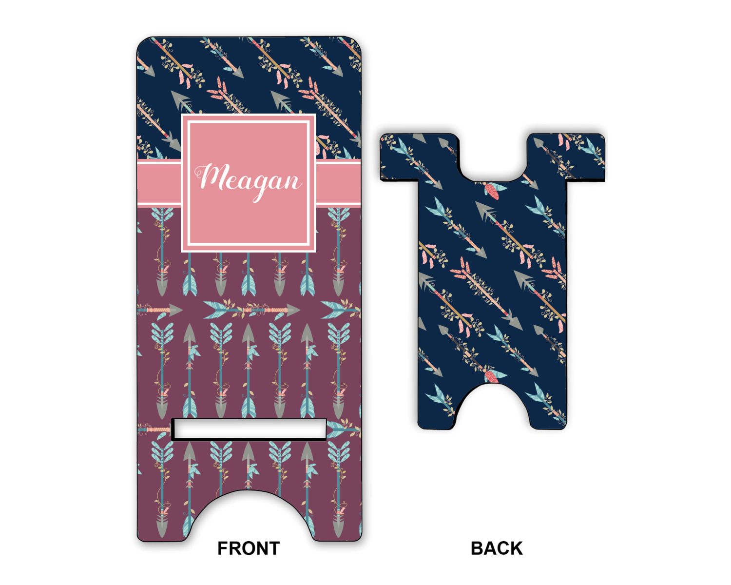 The cool navy blue and mauve really give this design a calming feeling. The two backgrounds have several different kinds of illustrative tribal arrows. Each one has slight variations in its beautiful detail. The soft blush ribbon and frame give a nice accent to both the navy and mauve. Put your very own personalization in the frame to get started.