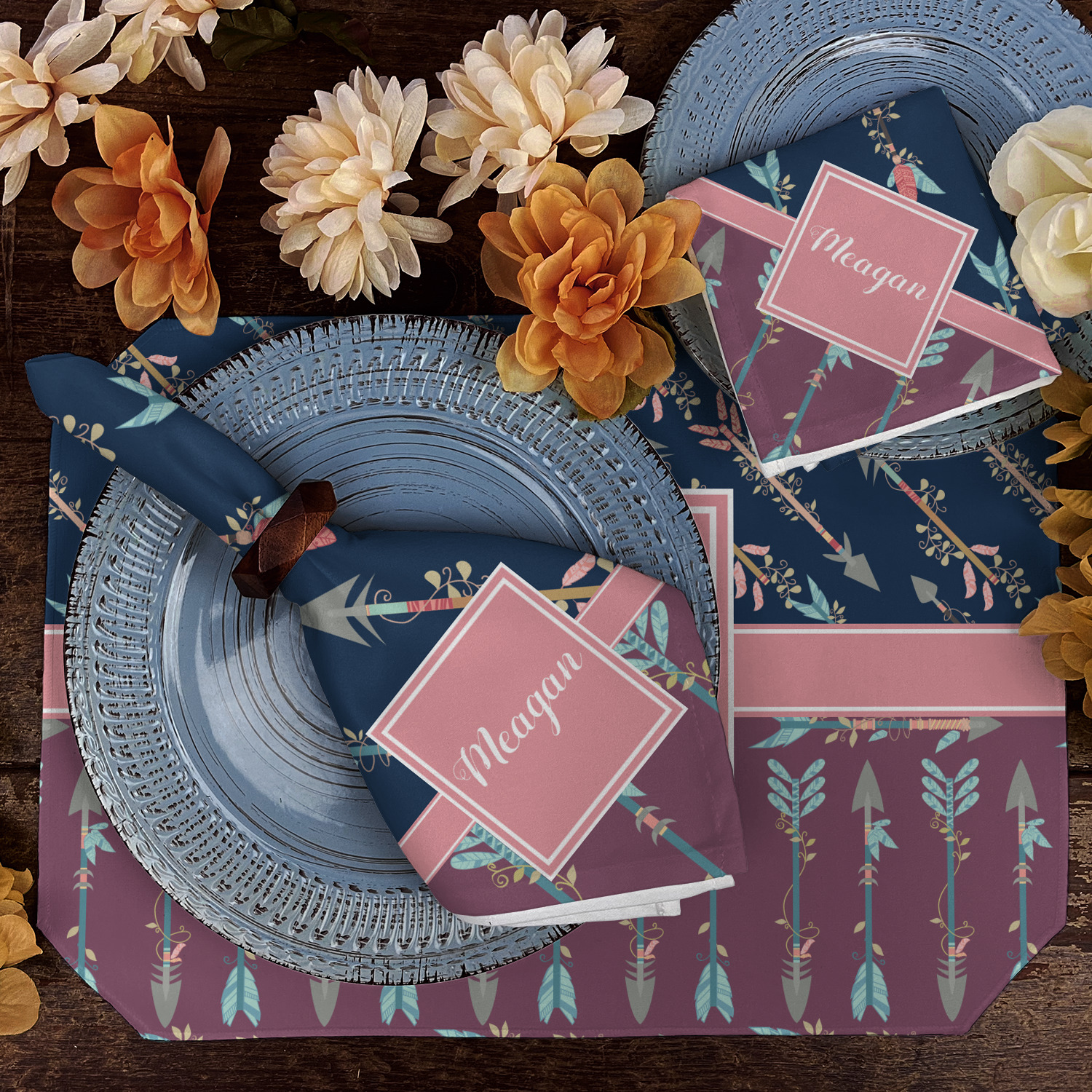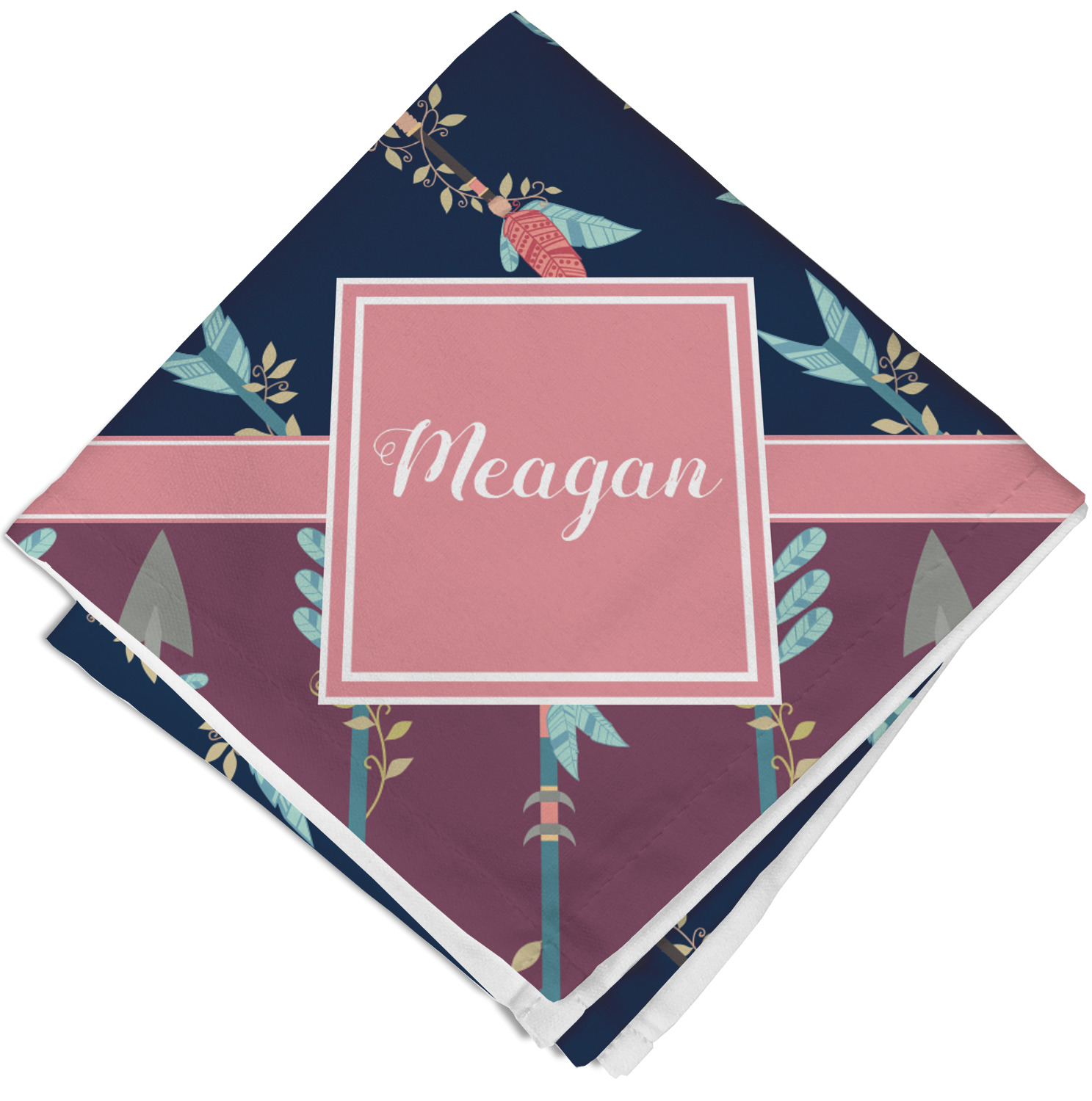 The cool navy blue and mauve really give this design a calming feeling. The two backgrounds have several different kinds of illustrative tribal arrows. Each one has slight variations in its beautiful detail. The soft blush ribbon and frame give a nice accent to both the navy and mauve. Put your very own personalization in the frame to get started.