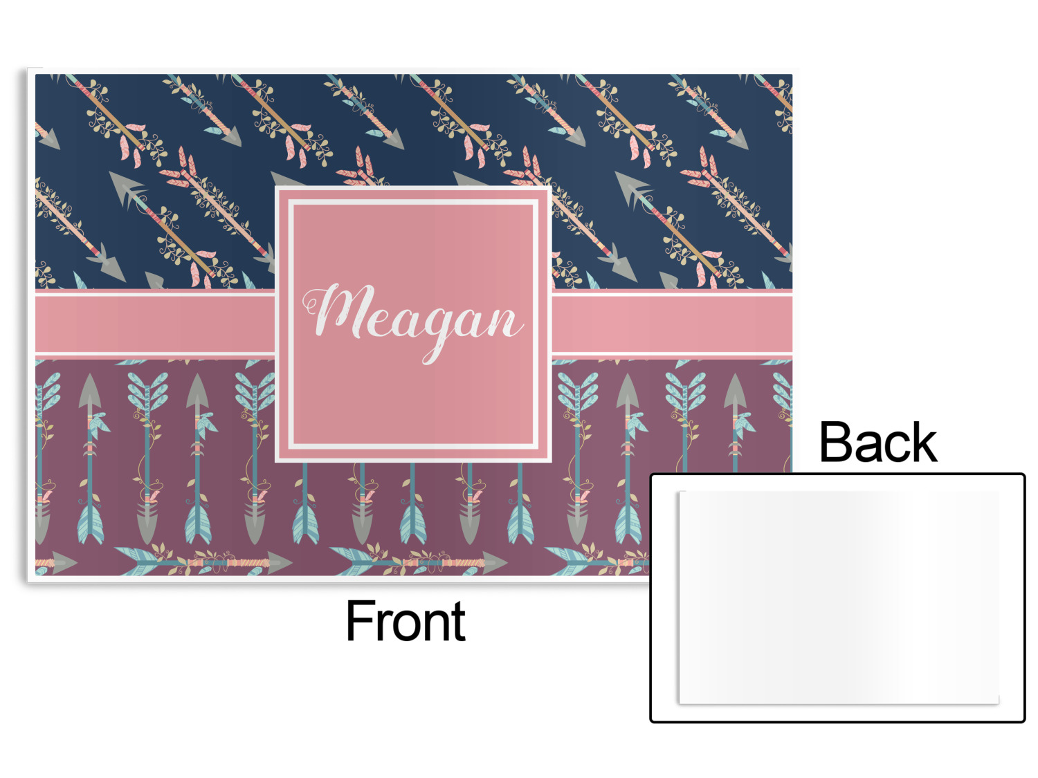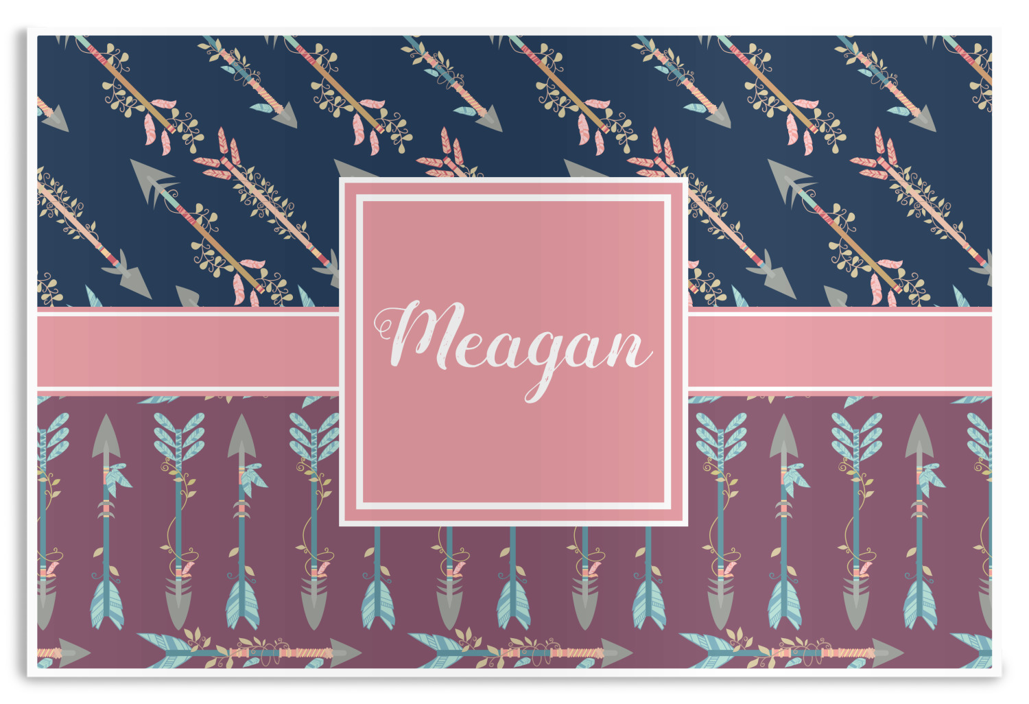 The cool navy blue and mauve really give this design a calming feeling. The two backgrounds have several different kinds of illustrative tribal arrows. Each one has slight variations in its beautiful detail. The soft blush ribbon and frame give a nice accent to both the navy and mauve. Put your very own personalization in the frame to get started.