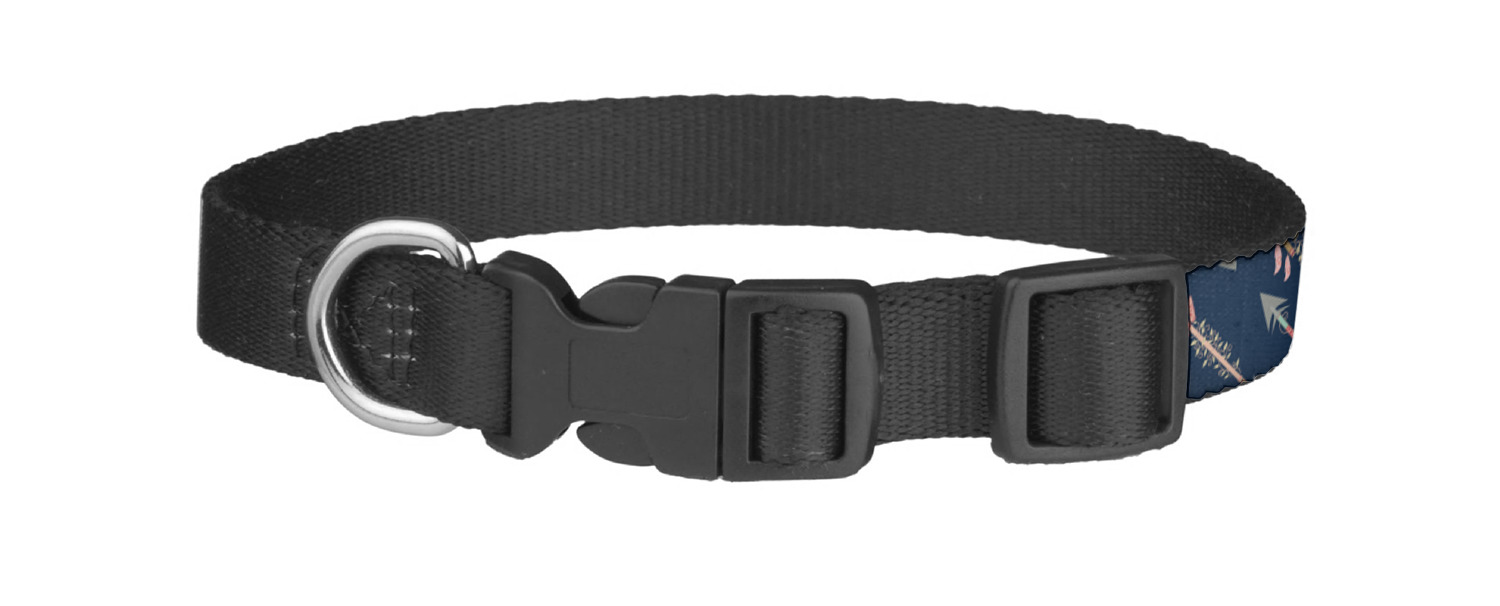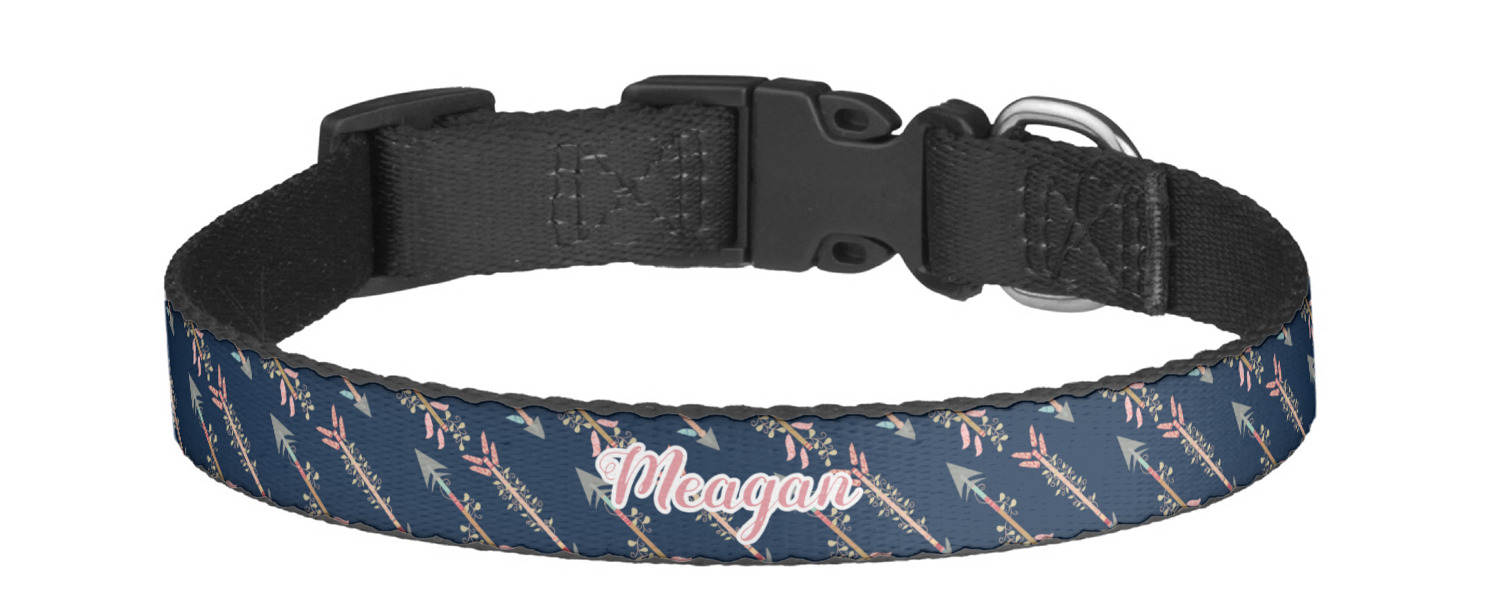 This sturdy collar, made from a durable nylon weave, will outlive your dog's episodes of excited tugging and pulling. Courtesy of its thick plastic buckle and adjuster, this collar is adjustable and accommodating of any dog. Structurally, the collar is a single piece of nylon weave that is sewn together, and features a solid metal loop where you can attach a leash or dog tag. We print and display your dog's name and pattern across the middle of the personalized dog collar.