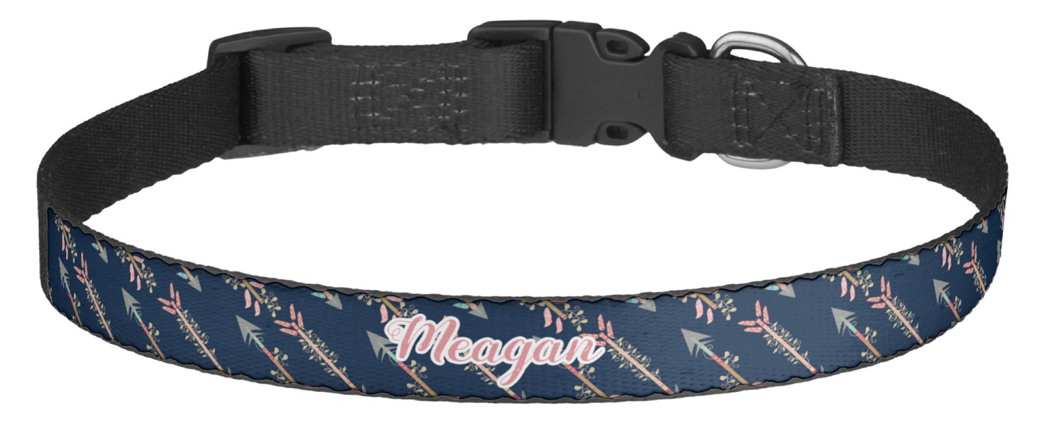 This sturdy collar, made from a durable nylon weave, will outlive your dog's episodes of excited tugging and pulling. Courtesy of its thick plastic buckle and adjuster, this collar is adjustable and accommodating of any dog. Structurally, the collar is a single piece of nylon weave that is sewn together, and features a solid metal loop where you can attach a leash or dog tag. We print and display your dog's name and pattern across the middle of the personalized dog collar.