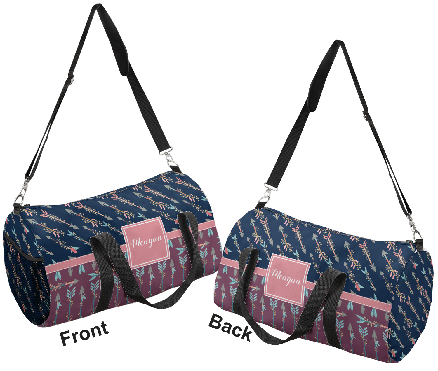 This duffle is a sturdy bag made of a canvas material. It comes in two sizes: Small (19"W x 9.5"H x 9.5"D) and Large (23"W x 12"H x 12"D). The bag is a cylindrical shape with a black adjustable strap and two handles. On one side is an elastic pouch to put a waterbottle or other small item. Your product will be sublimated with your design and is able to be designed on the front, back, and sides. Be sure to remember that the straps may cut into parts of your design if you upload your own artwork.