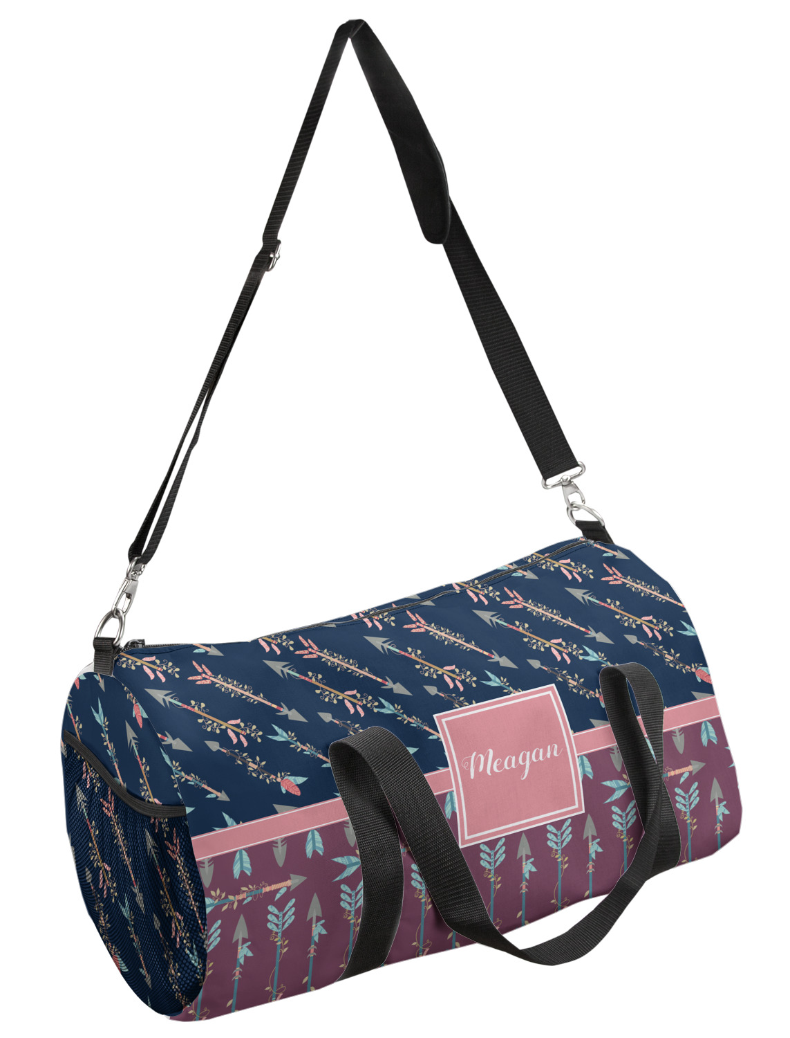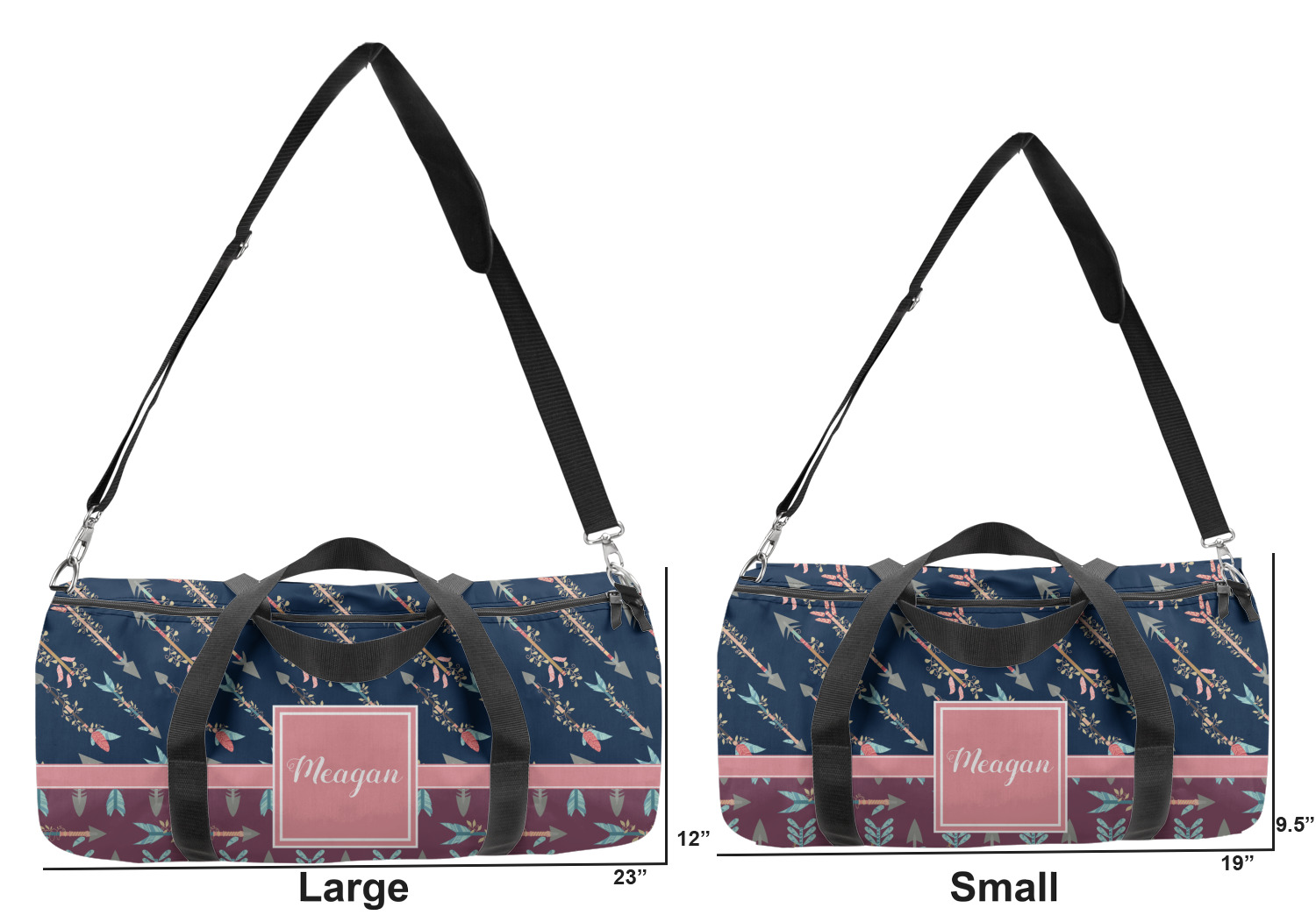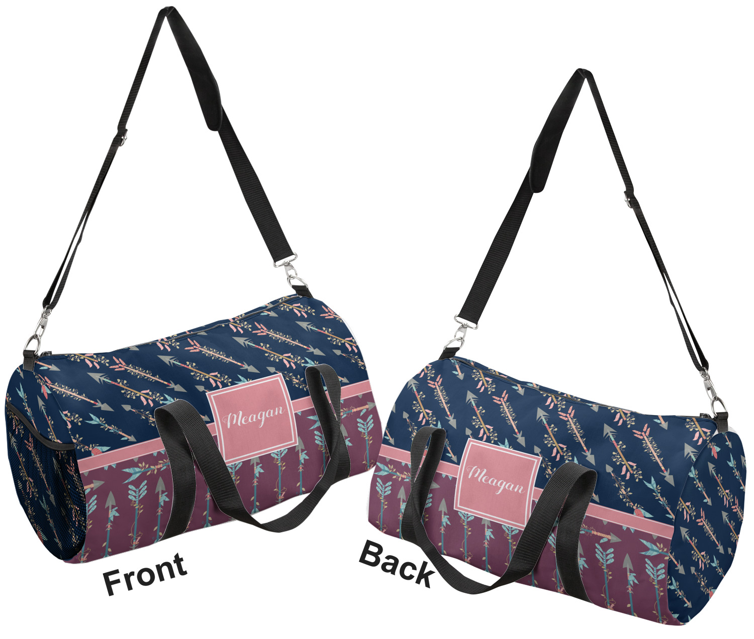 This duffle is a sturdy bag made of a canvas material. It comes in two sizes: Small (19"W x 9.5"H x 9.5"D) and Large (23"W x 12"H x 12"D). The bag is a cylindrical shape with a black adjustable strap and two handles. On one side is an elastic pouch to put a waterbottle or other small item. Your product will be sublimated with your design and is able to be designed on the front, back, and sides. Be sure to remember that the straps may cut into parts of your design if you upload your own artwork.