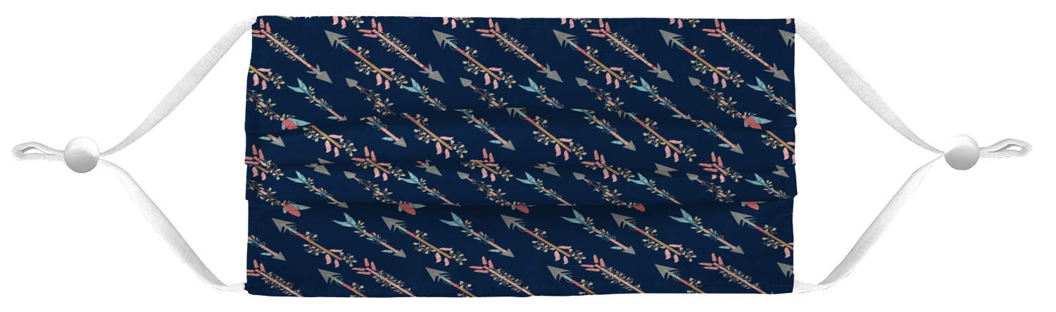 These fun face masks are 7" wide and 3.5" high. They feature pleats, adjustable ear loops, and are made with two layers of fabric. The top layer where your design is printed is a breathable polyester sheeting, while the inside layer is a soft microfiber polyester