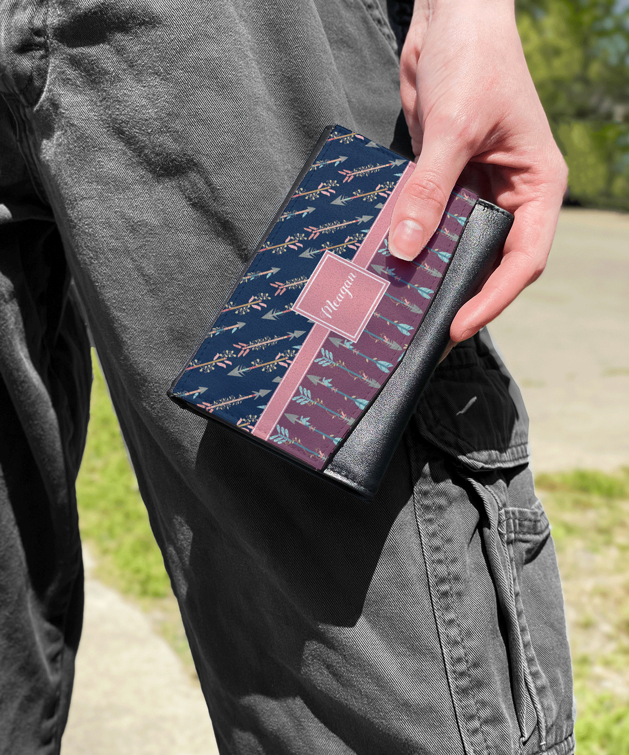 The cool navy blue and mauve really give this design a calming feeling. The two backgrounds have several different kinds of illustrative tribal arrows. Each one has slight variations in its beautiful detail. The soft blush ribbon and frame give a nice accent to both the navy and mauve. Put your very own personalization in the frame to get started.
