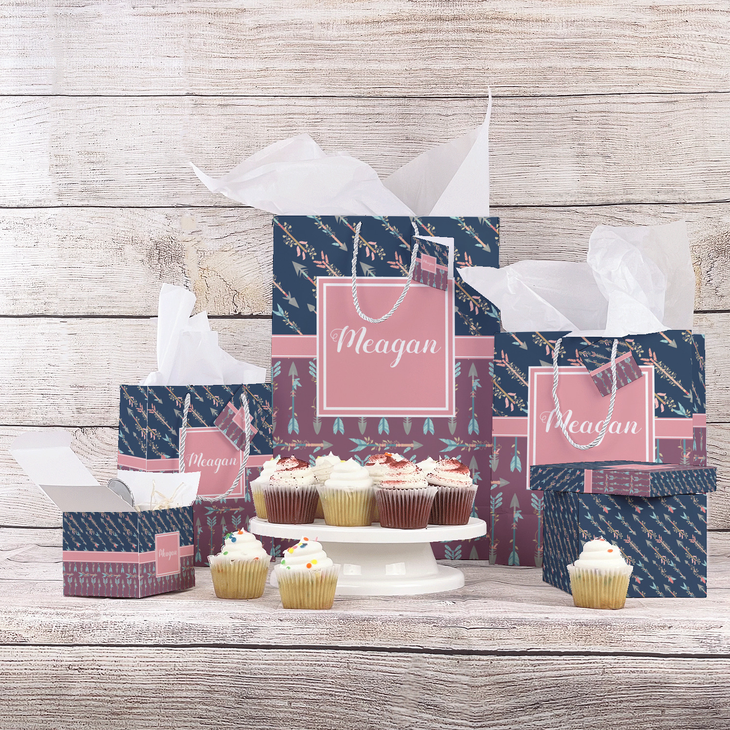 The cool navy blue and mauve really give this design a calming feeling. The two backgrounds have several different kinds of illustrative tribal arrows. Each one has slight variations in its beautiful detail. The soft blush ribbon and frame give a nice accent to both the navy and mauve. Put your very own personalization in the frame to get started.