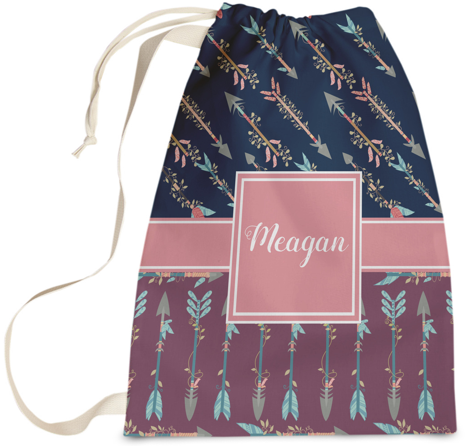 Carry your laundry in style with these customized laundry bags. Available in two sizes, featuring a natural colored woven strap and a cinch cord, these bags hold a lot of clothes or anything else you want to fit in them.