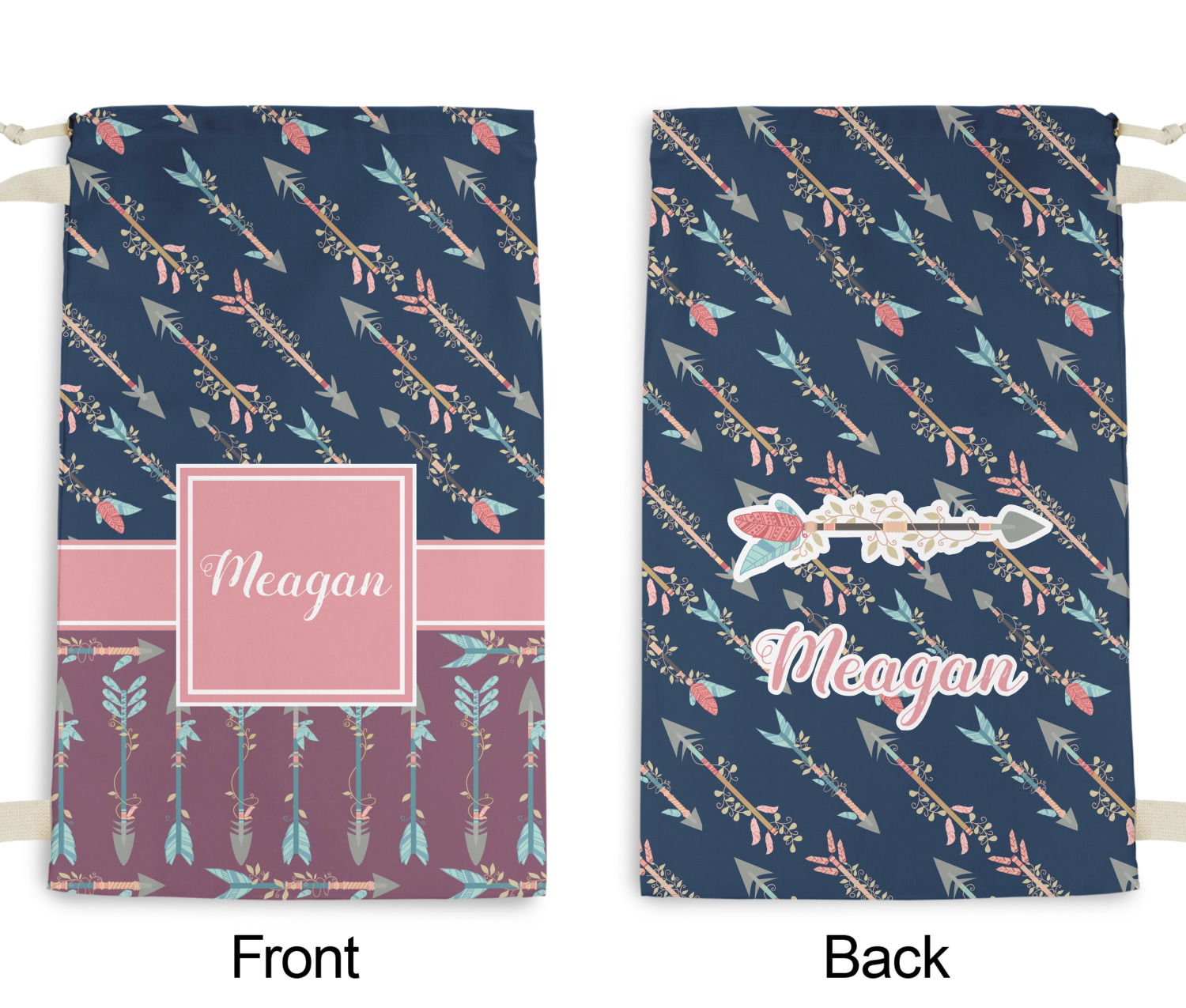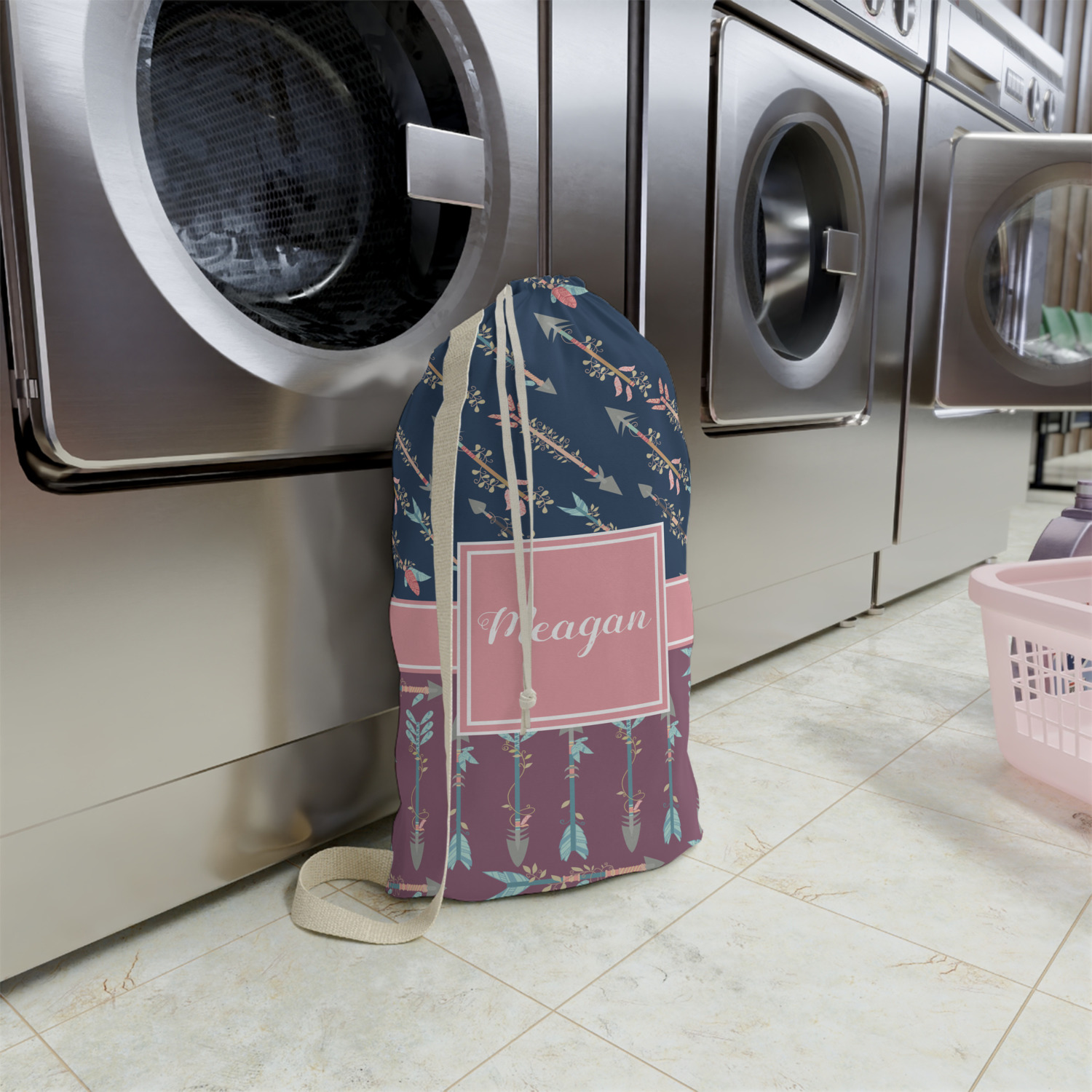 Carry your laundry in style with these customized laundry bags. Available in two sizes, featuring a natural colored woven strap and a cinch cord, these bags hold a lot of clothes or anything else you want to fit in them.