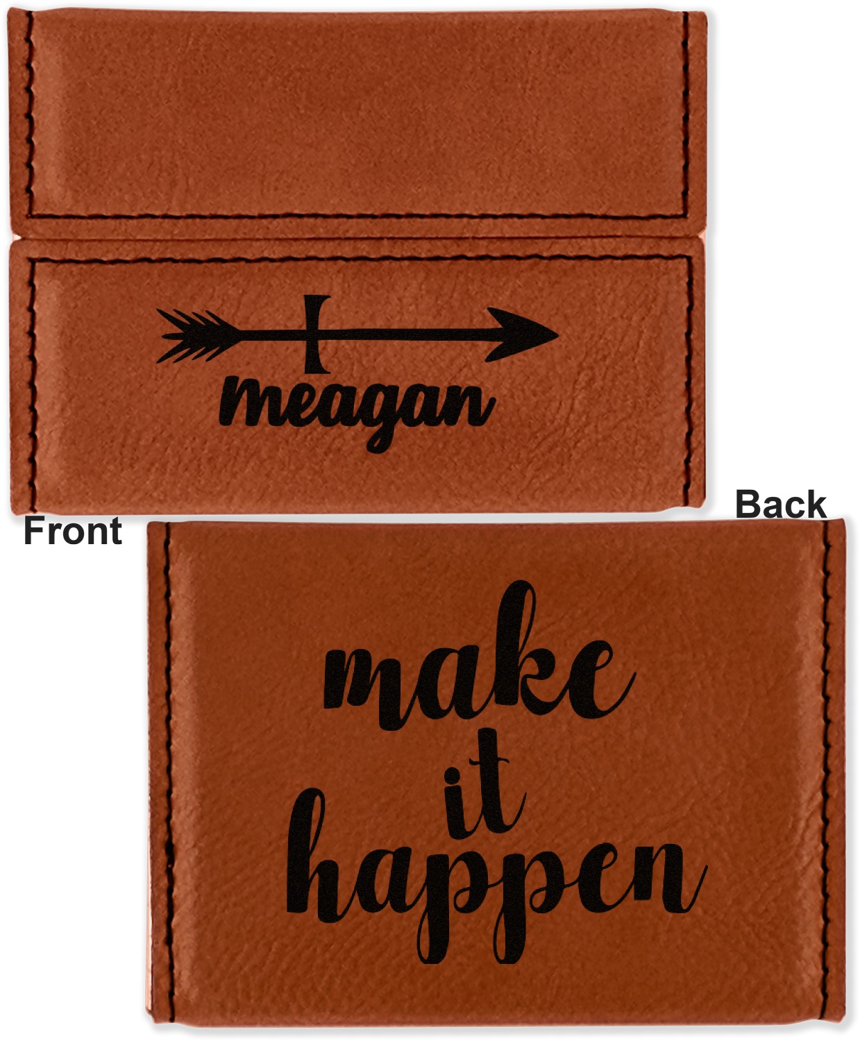 Your personalized design is laser engraved onto either the front, or the front and back of the card holder, depending on the model you purchase. Once engraved, the design will appear a darkened black against the cognac color of the leatherette.
